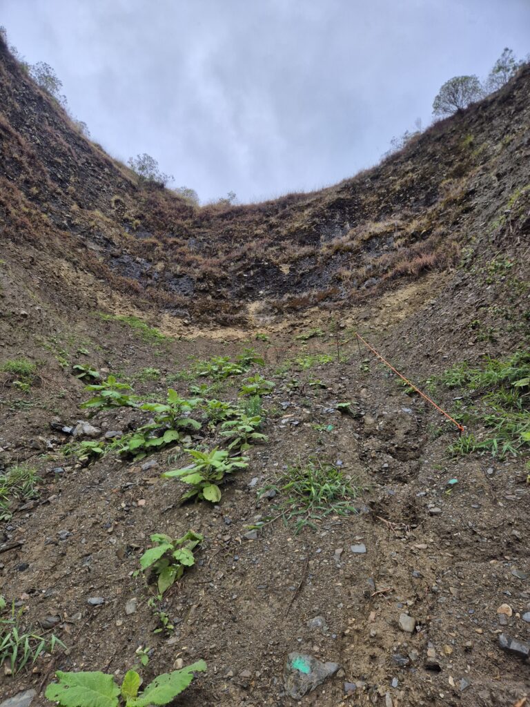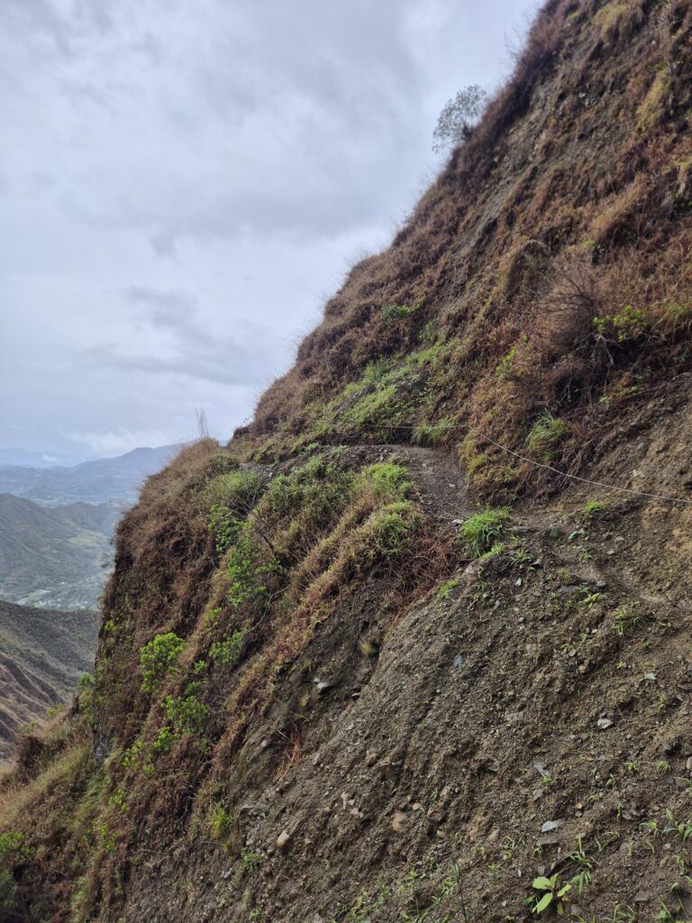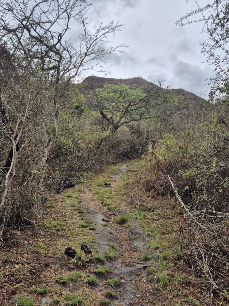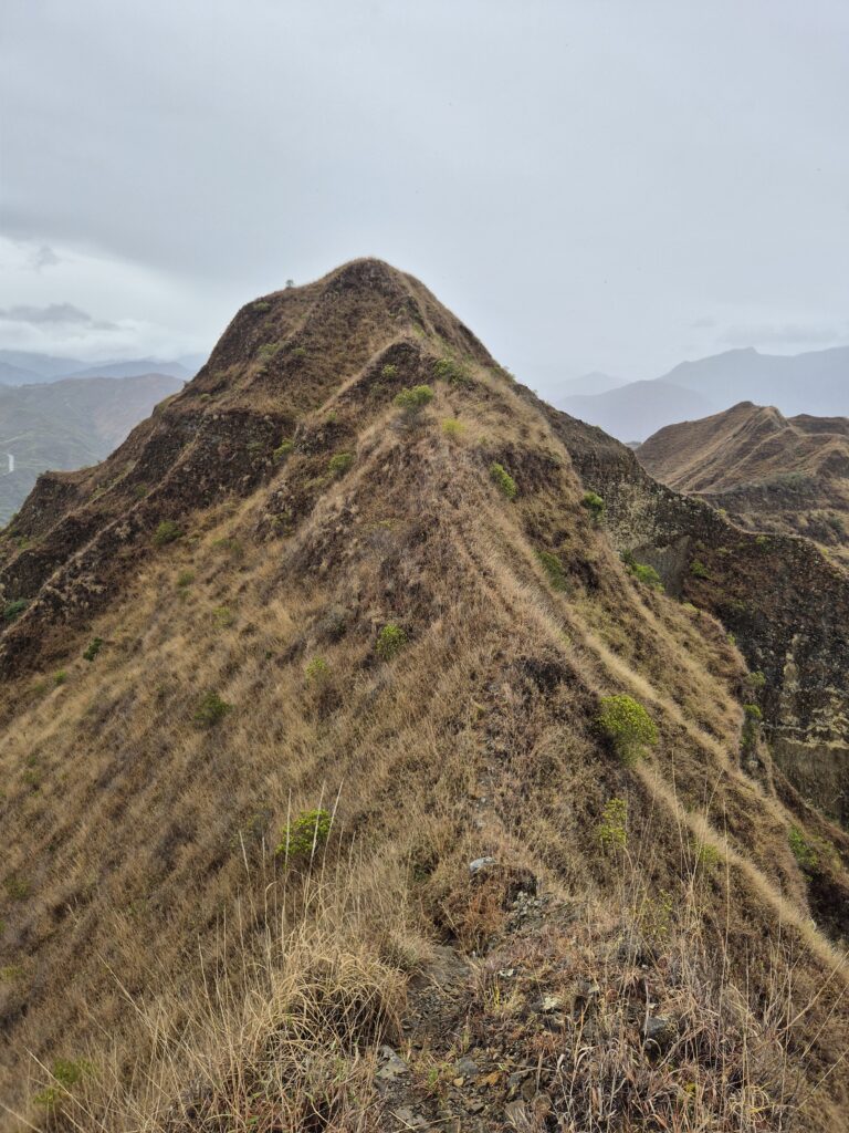 La suite est un peu plus escarpée jusqu’au sommet. Il faut longer le pied du monticule sur un sentier un peu éclaté, assez glissant notamment en cas de pluie (comme c’est bien sûr notre cas). Heureusement la dernière portion pour grimper sur la crête a été équipée de cordes fixes ces dernières années et se monte un peu plus aisément. Quelques passages dans les ravines sont plus compliqués à négocier, avec de sacrés cailloux branlants, notamment à la descente.