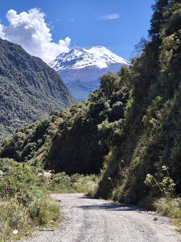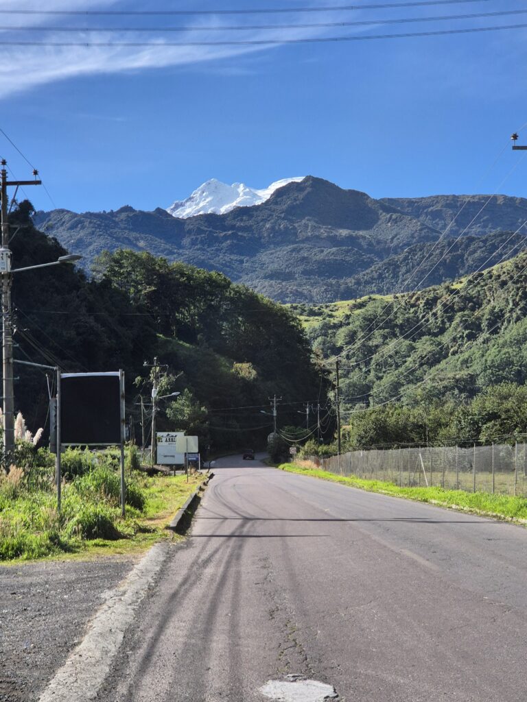 En fin de matinée, on récupère nos affaires à l’auberge (check-out à 12h) et on prend la direction de l’entrée sud Baños du parc Cayambe-Coca en suivant la route qui part derrière les thermes. La route ne présente pas un grand intérêt, sinon des vues superbes sur le volcan Antisana derrière nous.
