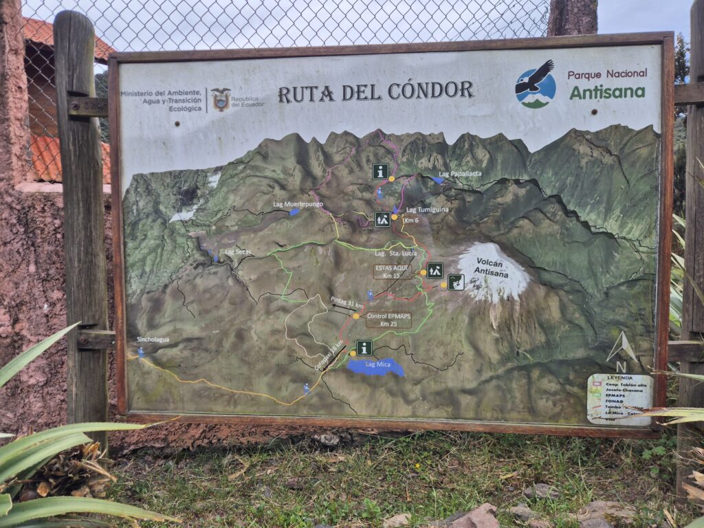 Le trek a une très, très mauvaise réputation en termes de navigation. Pas de balisage, pas forcément de sentier, des forêts à débroussailler, de la boue jusqu’aux genoux… Clairement il faut aimer les treks de sanglier pour se lancer dans pareille aventure ! En réalité, on trouve quelques poteaux ou panneaux épars, souvent recouverts de végétation ou perdus au milieu de nulle part. Ils témoignent d’un véritable trail qui serait peu à peu tombé en désuétude. Désormais d’autres sentiers se sont créés et sont à privilégier ; seule la portion entre la lagune Tumiguina/Volcan et l’arrivée sur les plaines de l’Antisana correspond encore à l’ancien tracé.