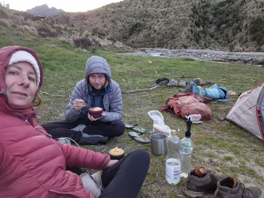 Bref, on débouche sur une grande plaine où on progresse un peu par hasard, avant d’apercevoir 2 locaux qui nous font signe au loin. Ils nous indiquent de descendre à la rivière pour traverser et nous proposent même leurs bottes, mais on décline poliment, on finira avec les pieds dans l’eau tôt ou tard. Ils nous content avoir récemment acheté ces terrains, ils souhaitent construire un hôtel, ou refuge, au départ du Condor. D’ailleurs ils sont en train de fêter ça avec une bouteille de rouge, évidemment mélangée avec du soda (quelle idée), qu’on partage avec eux.