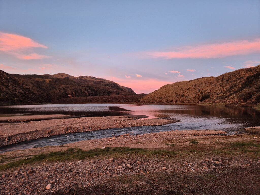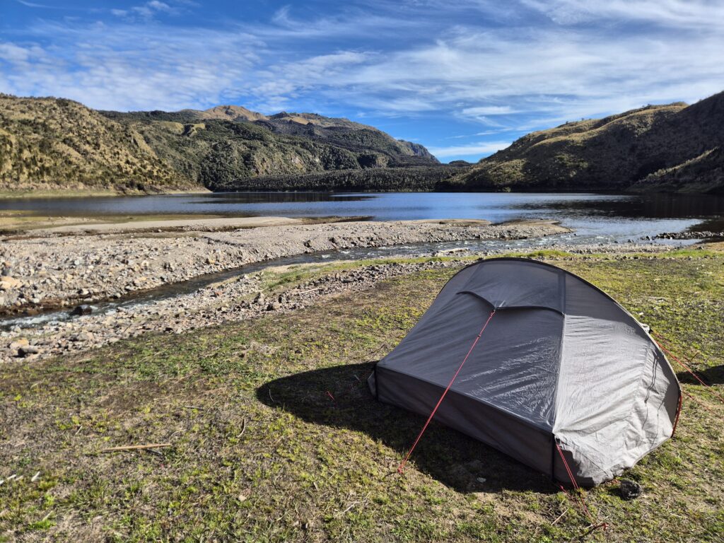 On se rend alors compte qu’on a dévié de la trace principale et on doit faire un détour longuet le long de la route pour la rattraper. On quitte donc le parc national de l’Antisana, devant le regard interrogateur des rangers avachis dans leur chaise, et on part poser la tente au bord de la rivière peu après avoir récupéré la trace. Il faut tâtonner mais il existe toujours des zones sèches autour des autres humides. Le cours d’eau n’est pas indiqué sur OSM mais il existe bien, d’est en ouest, au niveau de l’intersection entre la route à la laguna Mica et le tracé.