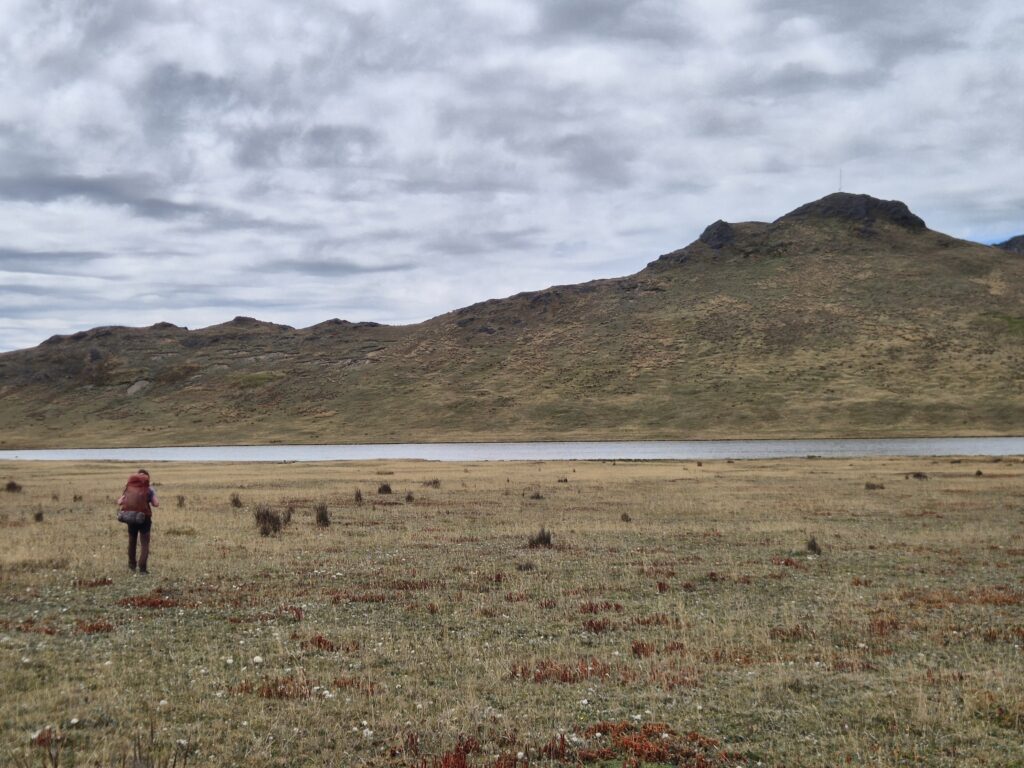 On aperçoit la lagune Taracocha, qu’on suppose être le 3ème bivouac officiel. Une zone est indiquée sur OSM un peu plus loin mais il y a un bon spot plat au bord de la lagune. Il est à peine 13h, on décide d’avancer, au grand désarroi de Camille.