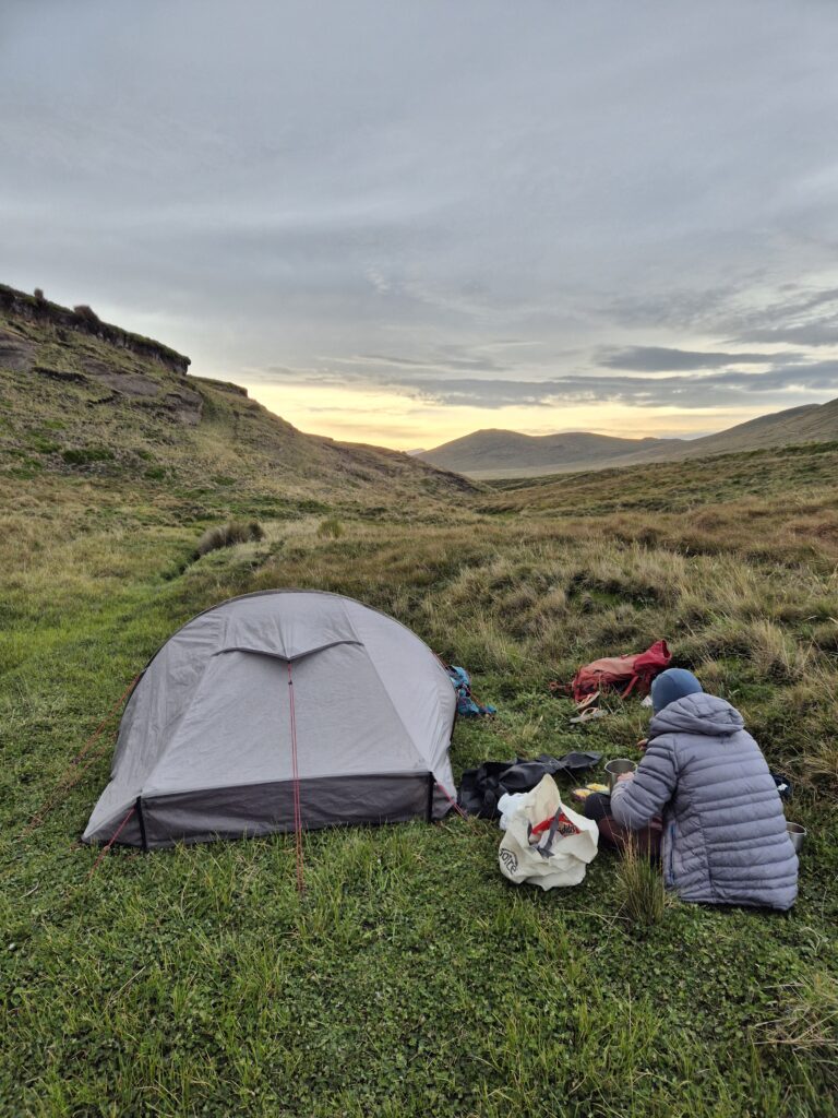 Ça y est, on redescend enfin ! C’est particulièrement rocailleux, et la fatigue n’arrange rien. On espère trouver un emplacement viable pour planter la tente mais on doit aussi trouver de l’eau, nos réserves sont à sec ! Malheureusement les différents ruisseaux annoncés sur la carte n’existent pas. On repère enfin une zone humide où s’écoule un mince filet d’eau. Comme souvent, il y a une partie plus sèche au bord, il faut un peu tâtonner et on finit par trouver le spot idéal.