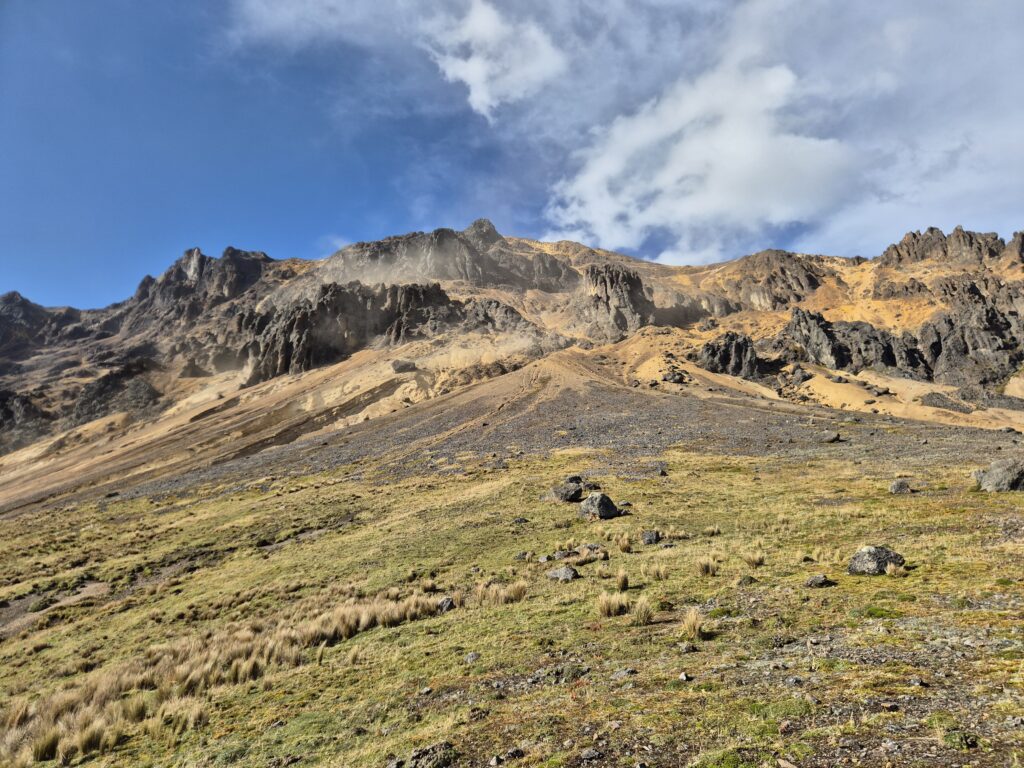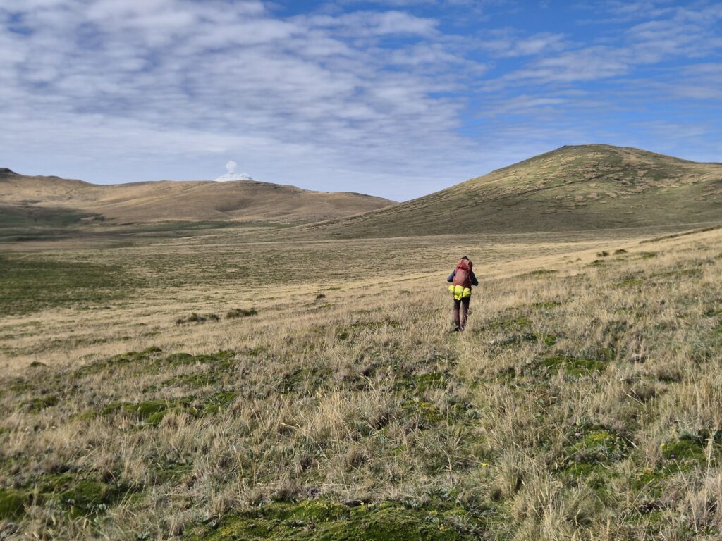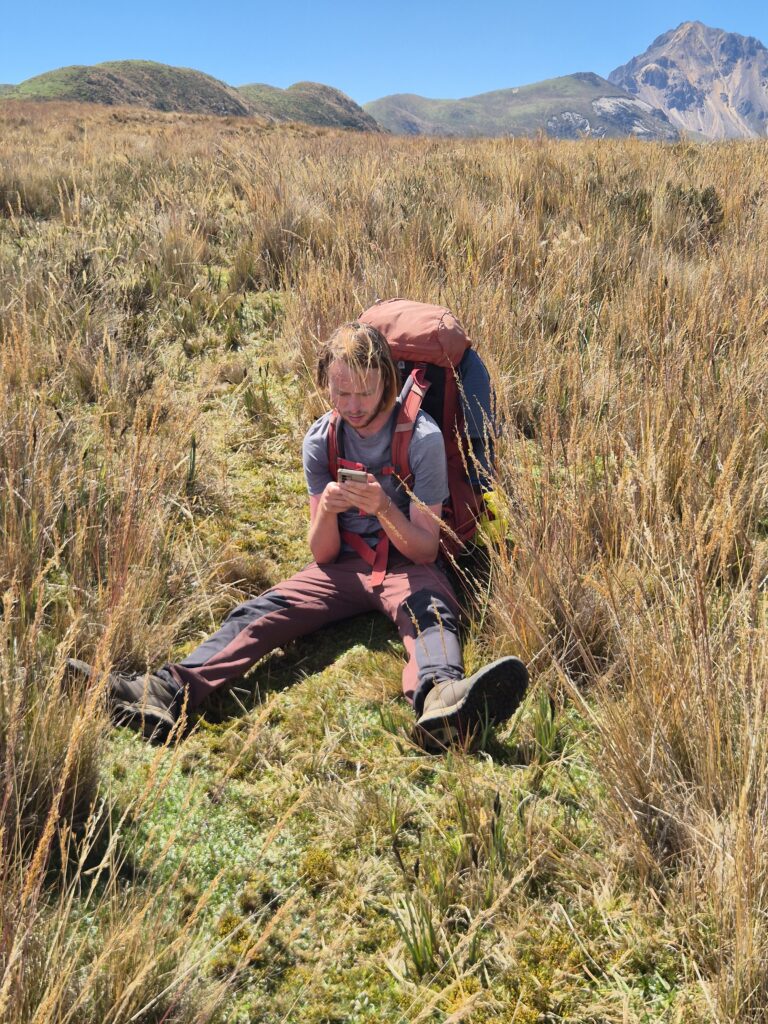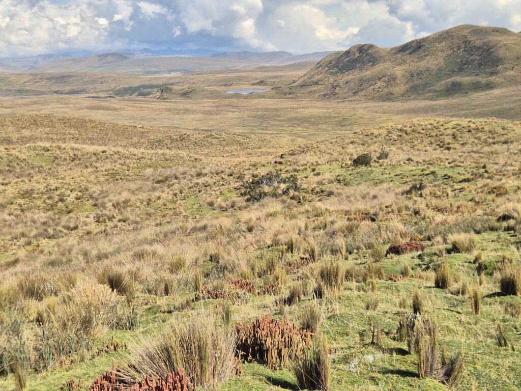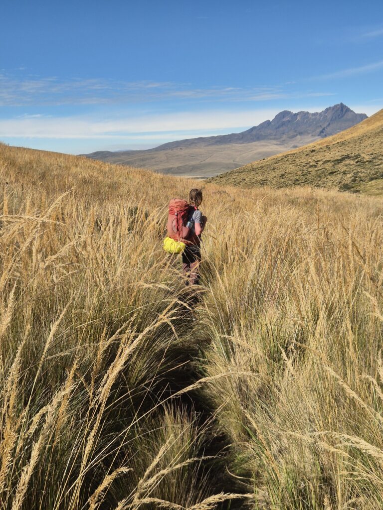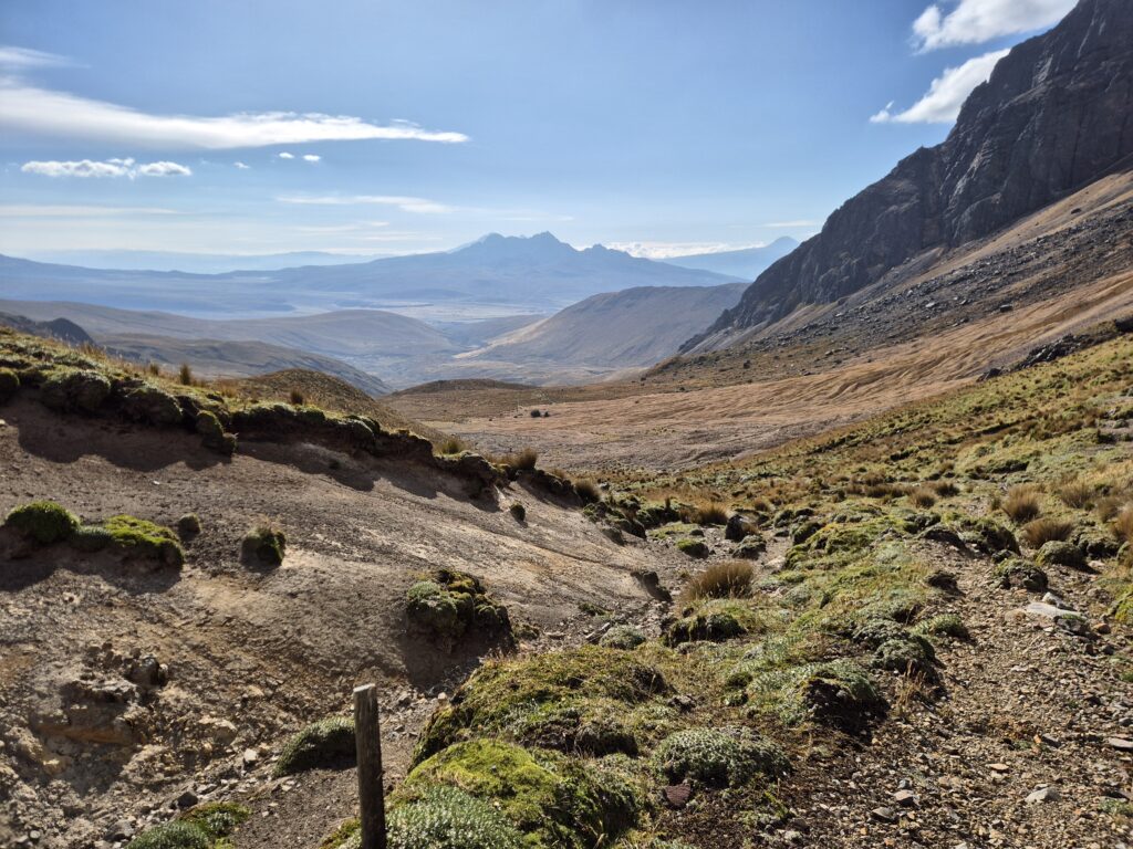 Ce matin, on pense en avoir fini avec les tourbières et ces paillasses infernales. On s’imagine un petit sentier pierreux. Quelle naïveté ! On fait 2-3 allers-retours sur la route avant de se rendre à l’évidence, il n’y a toujours pas de trace. On coupe donc au travers de la prairie humide en sautant entre les quelques plantes fermes, on sait désormais les identifier assez rapidement. On longe ensuite les collines sur la droite, il y a des hautes herbes mais le sol est désormais sec. Après le col, un court sentier puis rebelote, on traverse le centre de la quebrada, humide, et on tente de se frayer un chemin parmi les hautes herbes. Au diable la trace qui semble couper au travers, on poursuit sur un sillon que l’on a trouvé et que l’on qualifierait de « pas si pire ».