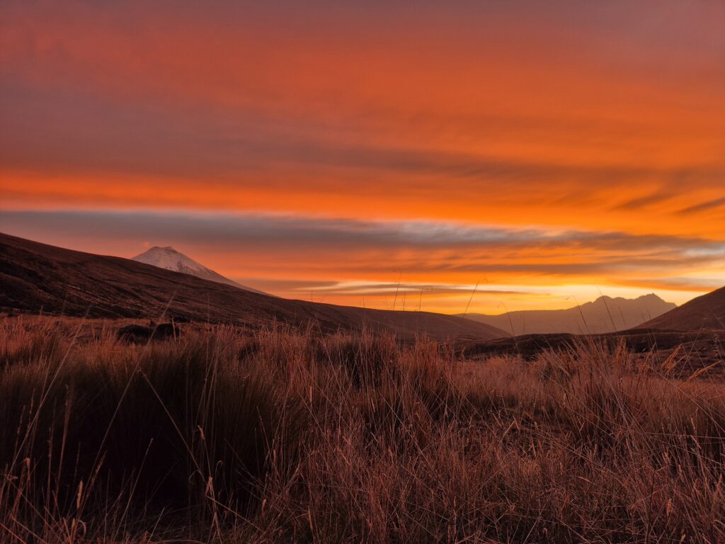 Une première journée déjà compliquée et le plus dur reste sans doute à venir avec la terrible étape pour sortir du parc Antisana. Pourtant, on sait que nous avons bénéficié d’une météo parfaite et on jouit paisiblement d’une belle soirée et d’un coucher de soleil exceptionnel.