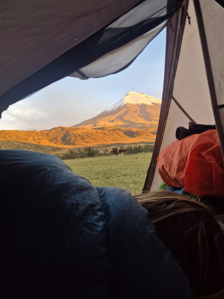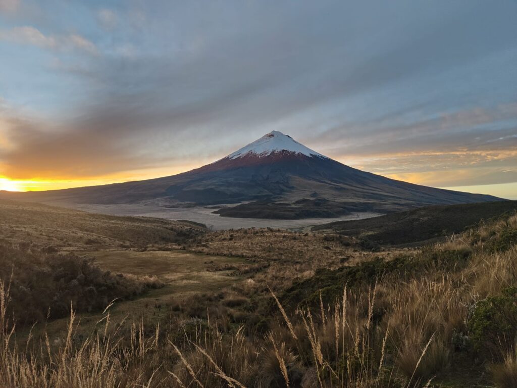On rejoint finalement le campement (3$/p) à quelques kilomètres. La vue est superbe, il y a un abri et des toilettes. On profite d’un dernier coucher de soleil formidable sur le dôme parfait du Cotopaxi, le fameux « cou de la lune ».