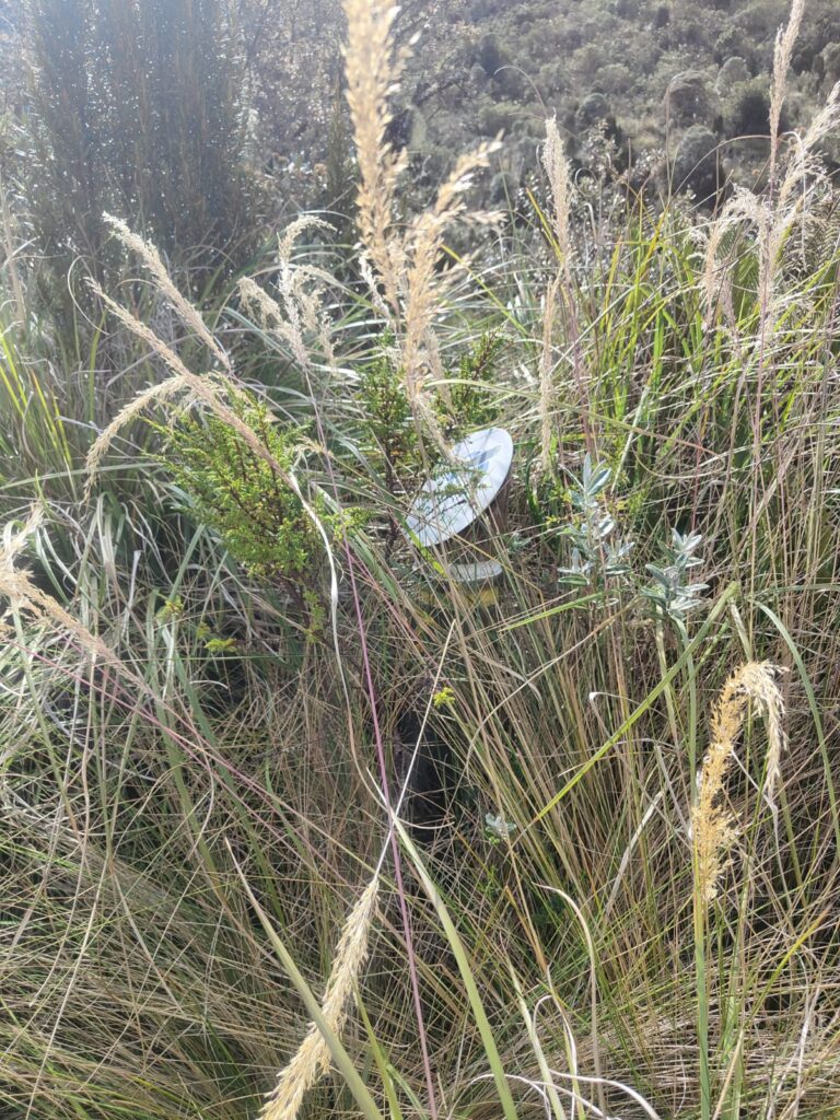 La nuit a été fraîche mais rien de bien méchant et la tente est même relativement sèche. On profite des premières lueurs du soleil pour petit-déjeuner dans ce décor fabuleux puis on se met en route. La carte semble repasser 2 fois la rivière à gué. De bon matin, ça ne nous tente guère de mettre les pieds là-dedans alors on tente de suivre la rive parmi les hautes herbes. Ce n’est pas toujours académique mais on s’en sort en enjambant ensuite 2 petits ruisseaux pour trouver un nouveau campement. A nouveau, le départ n’est pas clair et on se bat avec la végétation, dré dans le pentu, avant de tomber par hasard sur une tranchée bien marquée. Jusqu’au plateau de l’Antisana, la direction ne sera plus un problème et on croise même des piquets régulièrement voire quelques panneaux camouflés !