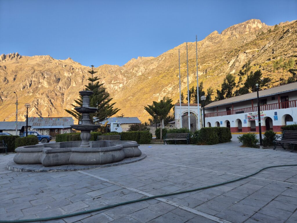 On ne sait pas vraiment ce qu’on attend, aucun horaire n’est affiché nulle part. Un collectivo est garé devant, on demande, bingo. Il se rend à Charcana (10s/p), un village à 2h de route, et le point de départ de notre randonnée du jour. A 5h on est déjà en route et prolonge la nuit dans ce bolide qui serpente et s’élève, semble-t-il (il fait encore nuit noire), sur les flancs du canyon. Petite indigestion (trop) classique, John est pris de maux d’estomac. 2h, c’est long, et il descend en urgence à quelques kilomètres de l’arrivée… Trop tard, le mal est fait, on vous passe les détails ! Il terminera le trajet à pied jusqu’à Charcana.