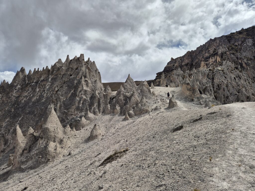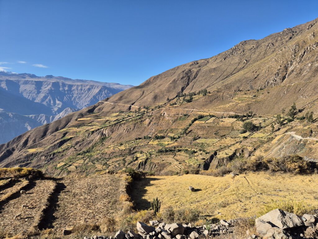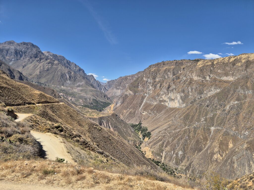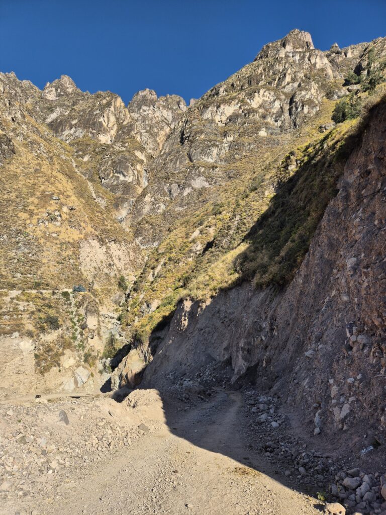 On suit une piste (sans aucun trafic) un bon moment, avant qu’elle ne se transforme en sentier cassant sur la dernière portion. Le paysage reste assez similaire à celui de Colca, très aride.