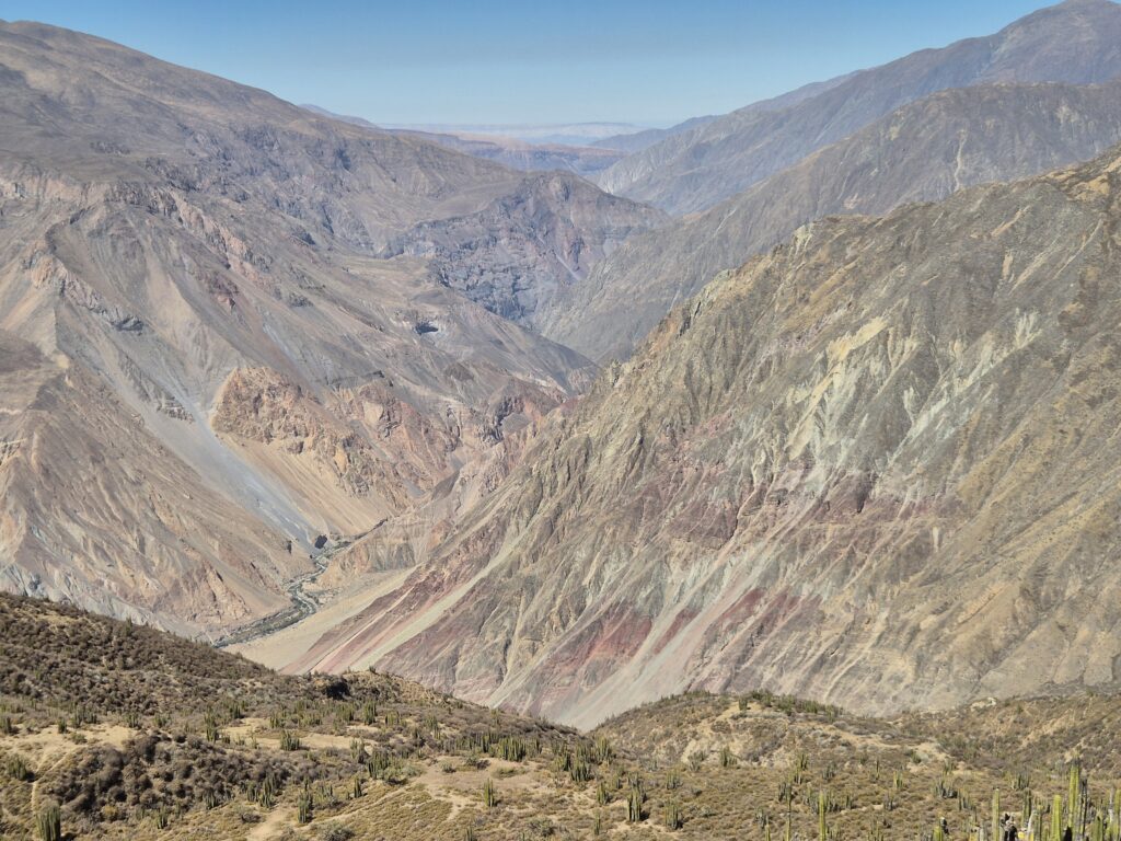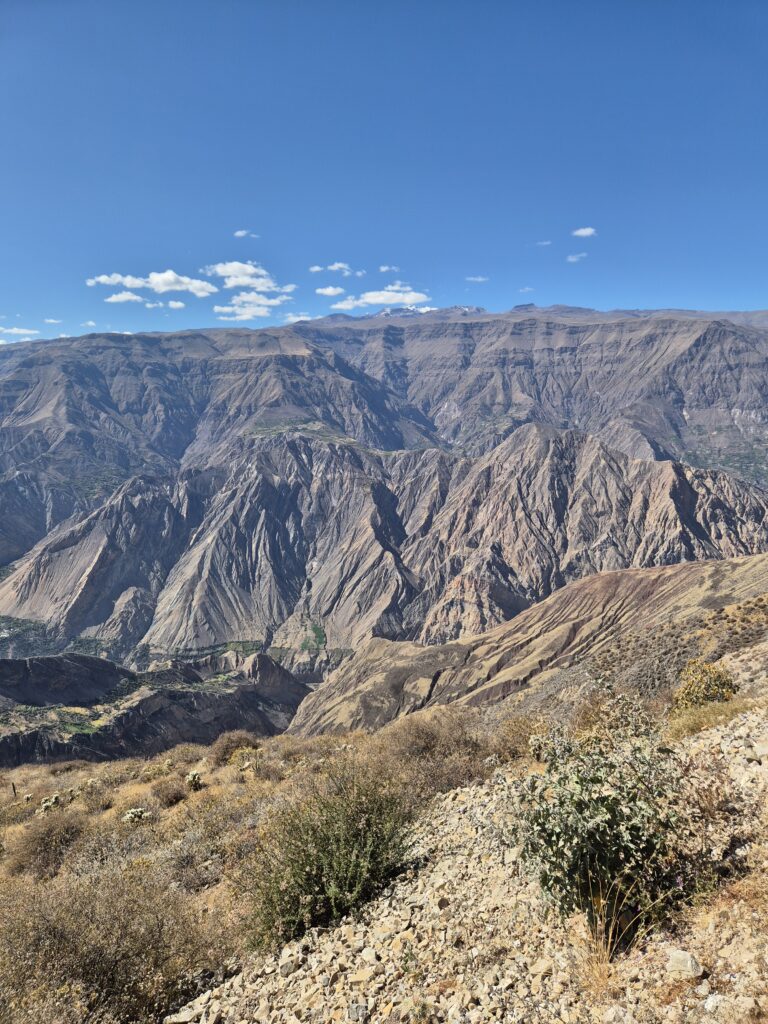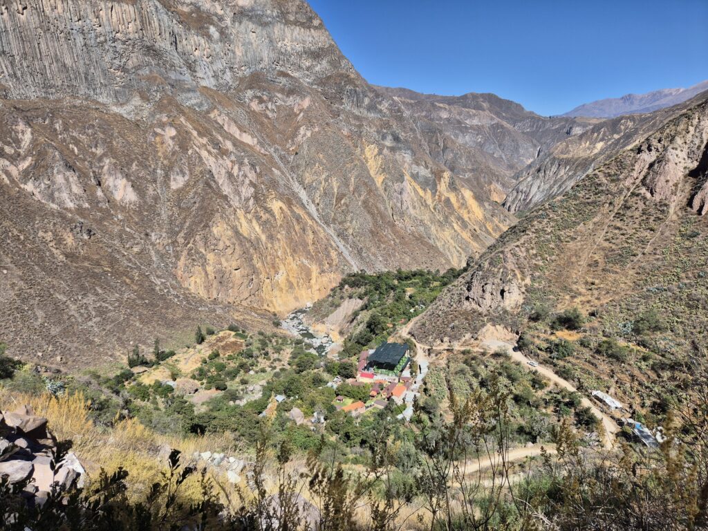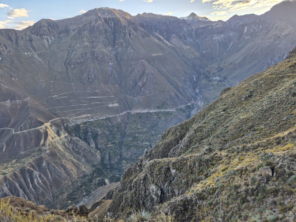 La route est désertique mais offre quelques beaux points de vue sur le volcan Chachani et la réserve de Salinas y Aguada Blanca. On passe un col assez élevé (et froid) puis on descend à Chivay avant de longer l’impressionnant canyon (mieux vaut être placé à droite du bus pour en profiter à l’aller).