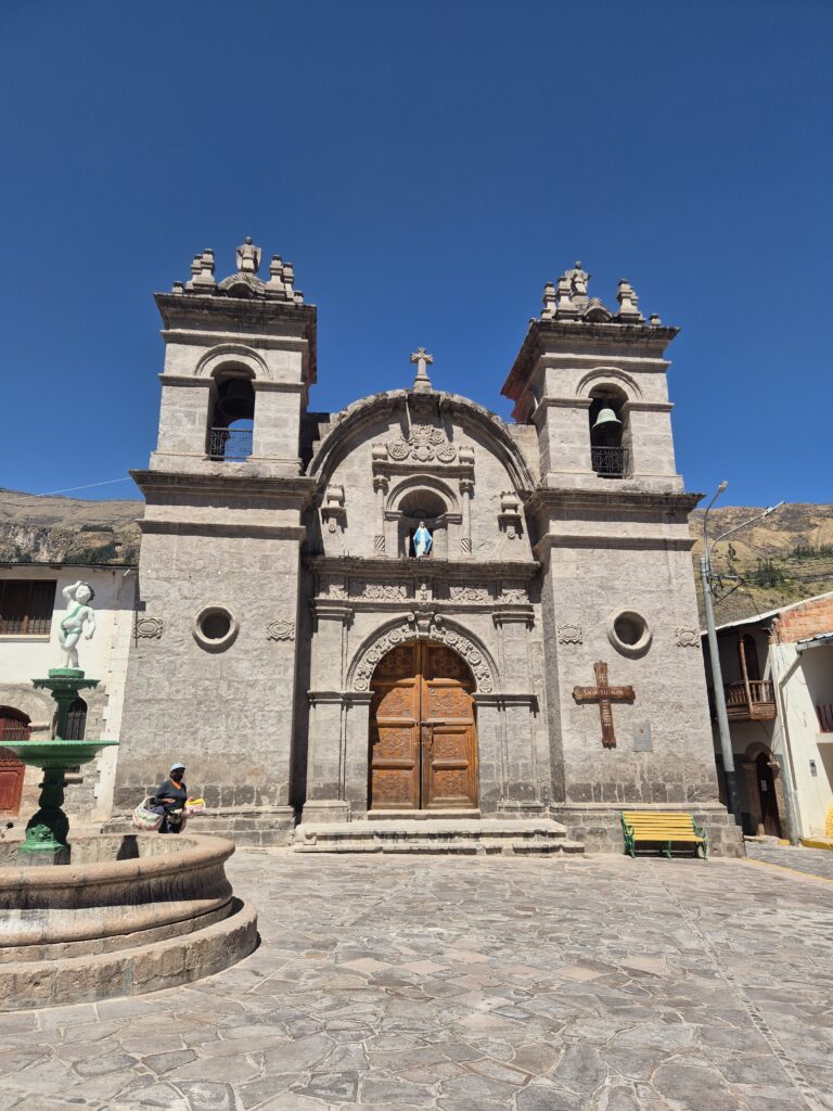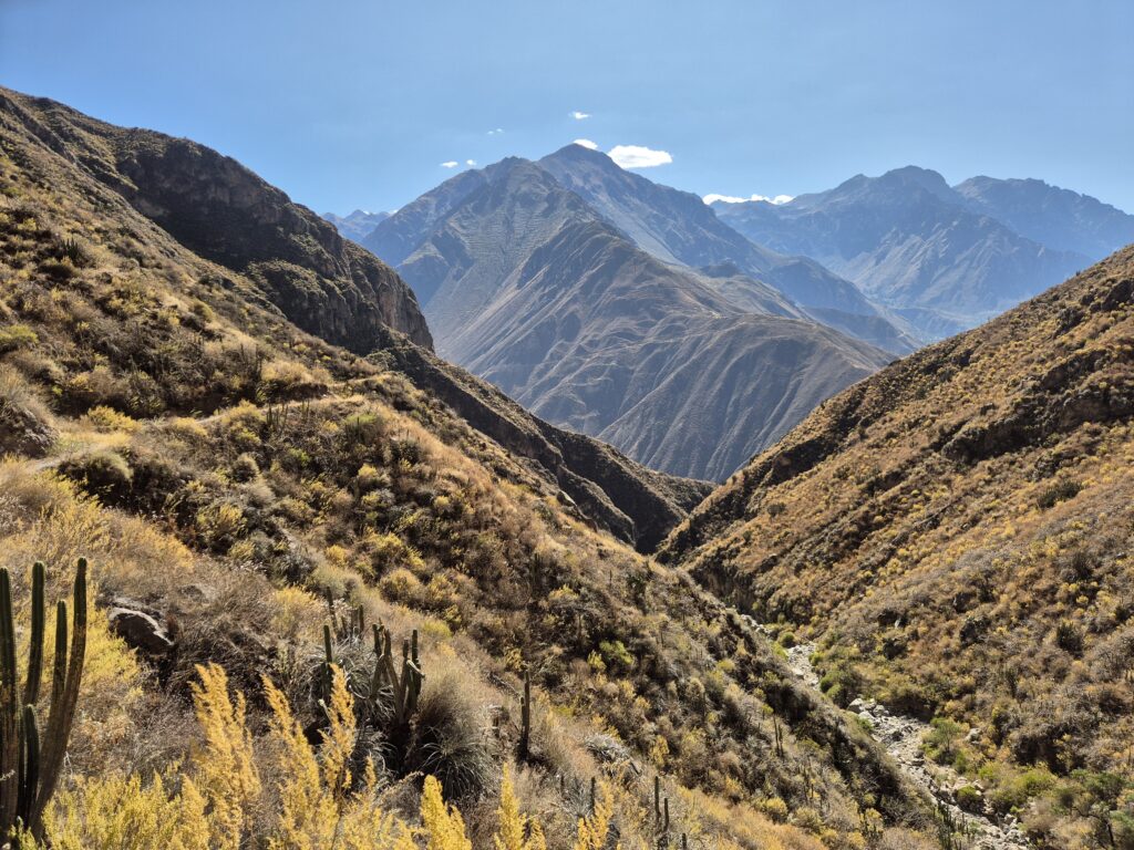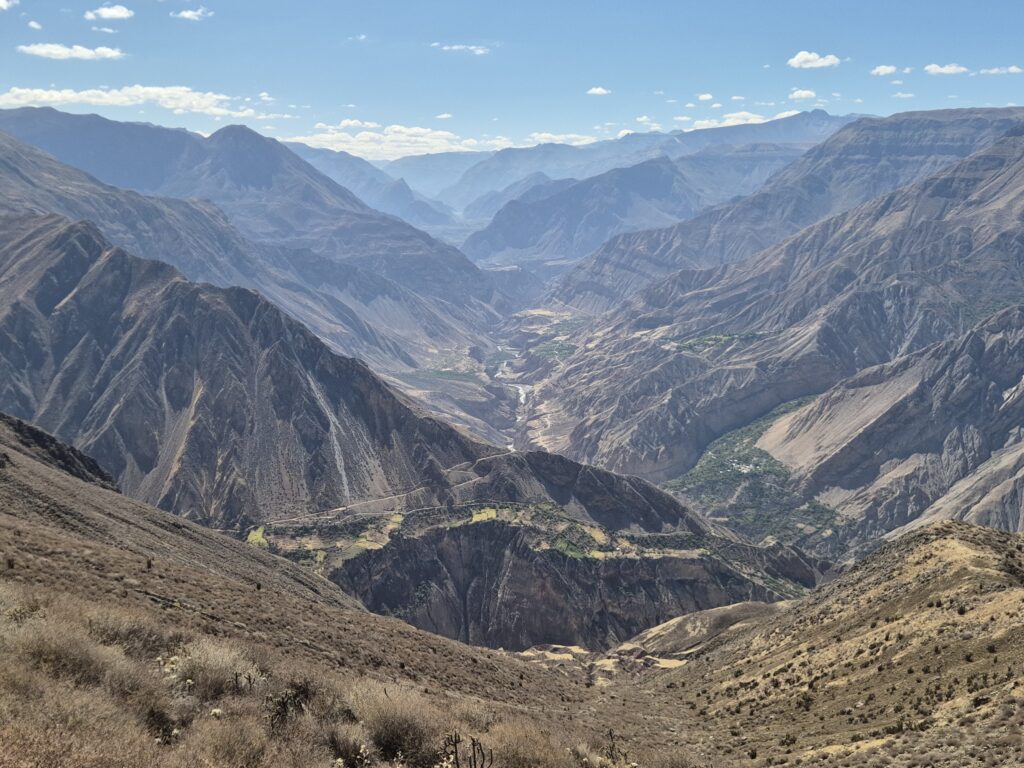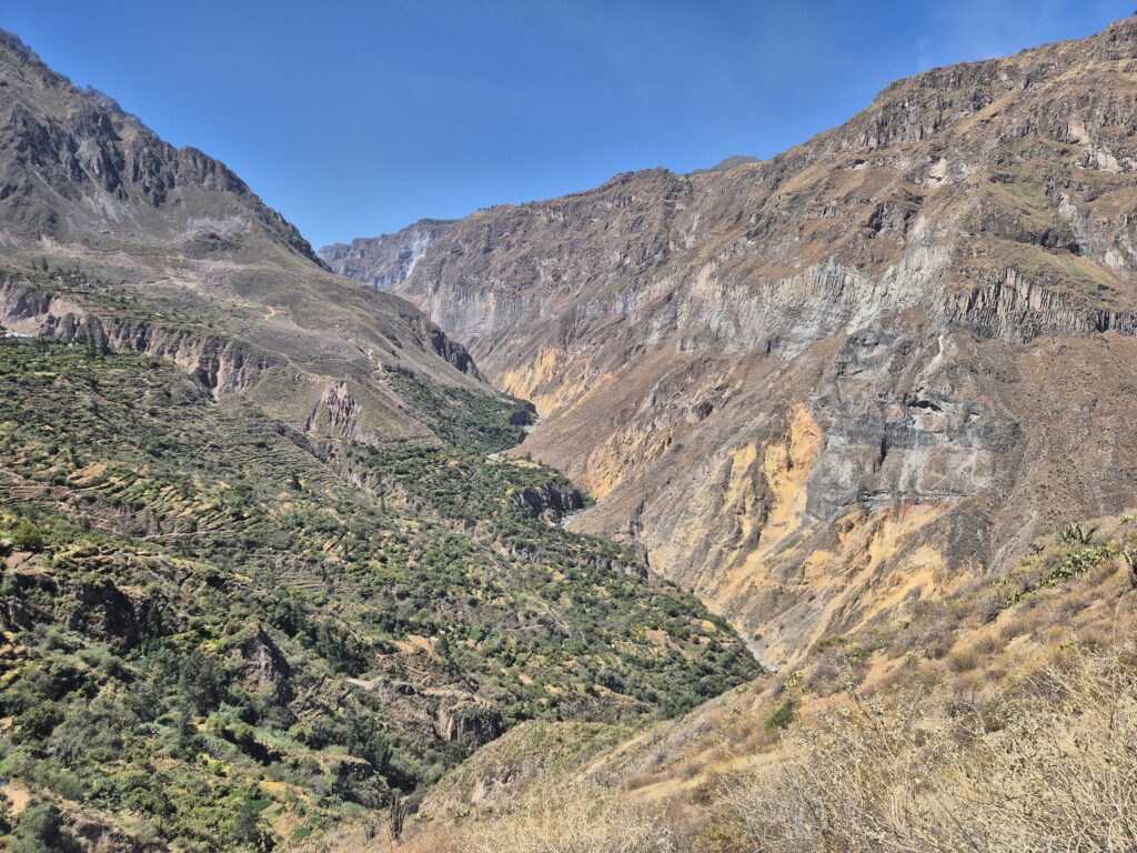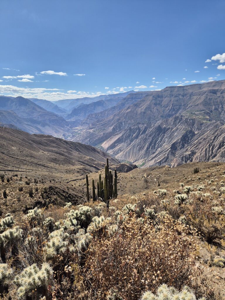 La route est désertique mais offre quelques beaux points de vue sur le volcan Chachani et la réserve de Salinas y Aguada Blanca. On passe un col assez élevé (et froid) puis on descend à Chivay avant de longer l’impressionnant canyon (mieux vaut être placé à droite du bus pour en profiter à l’aller).