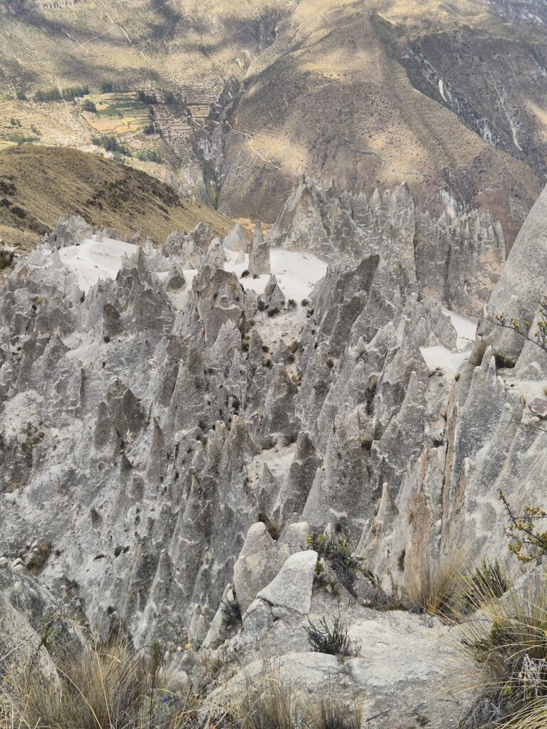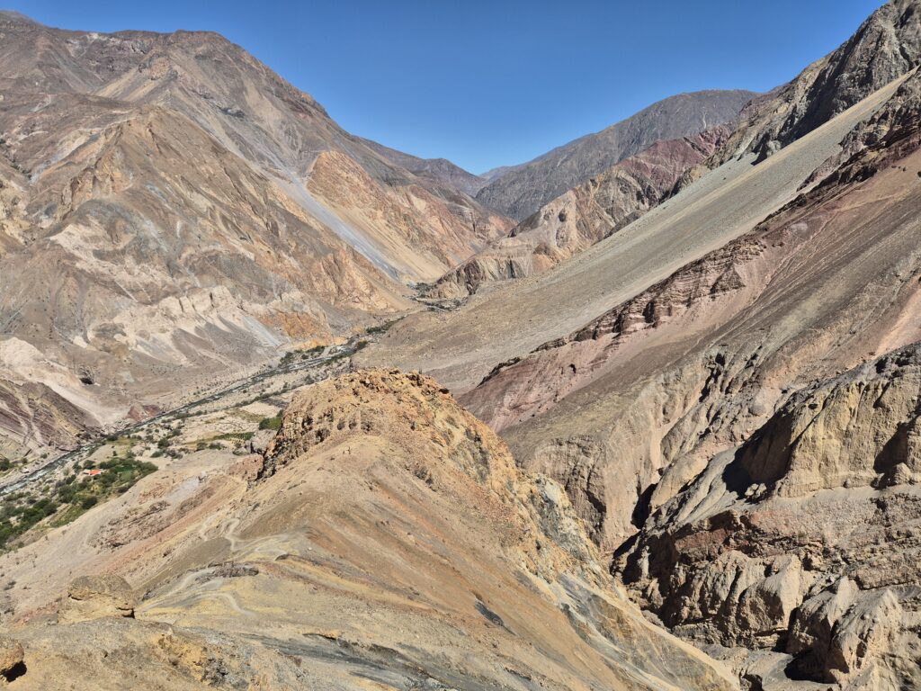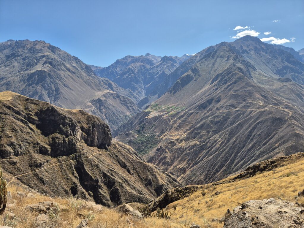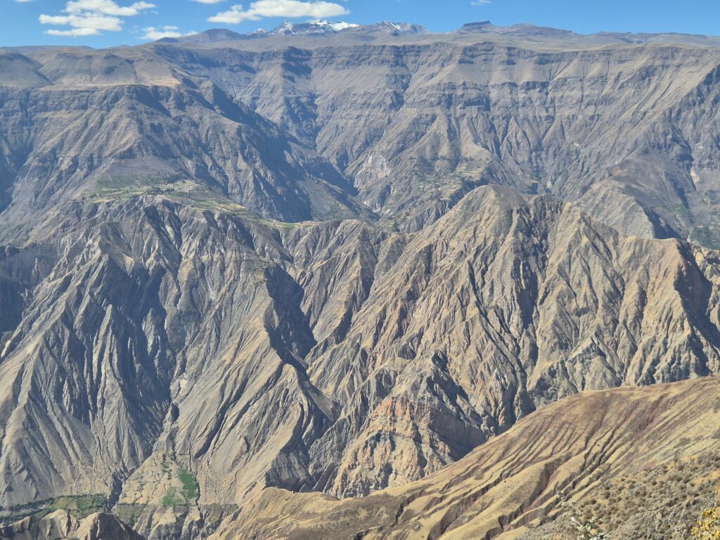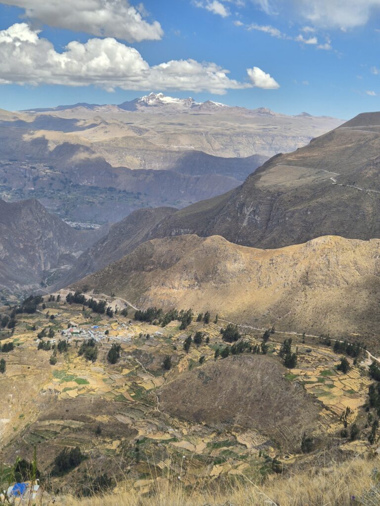 Au loin on aperçoit d’imposants nevados qui culminent au-delà des 6000m. Tout en bas dans la vallée, quelques zones verdoyantes signalent les rares villages.