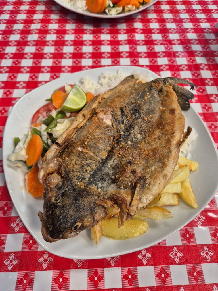 On fait un tour au marché, grand hall sans vie, où on trouve quand même un stand pour le déjeuner, large assiette de truite frite avec une chicha morada, pour 15s/p.