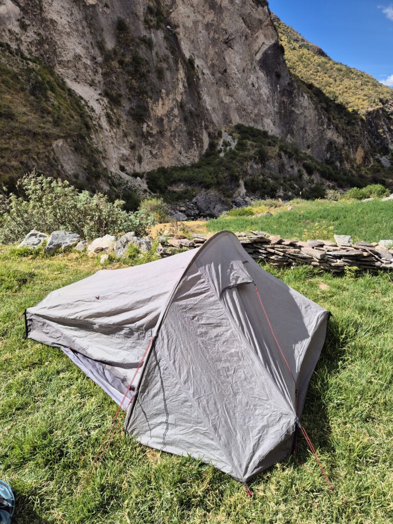 Trouver un emplacement de bivouac dans le canyon n’est pas chose aisée. On ne cherche pas particulièrement un spot caché, il n’y a rien à craindre dans cette région isolée. En revanche, c’est très pierreux et accidenté. On finit par se poser près d’une vieille ruine. Ce n’est pas parfaitement plat mais ça fera amplement l’affaire.