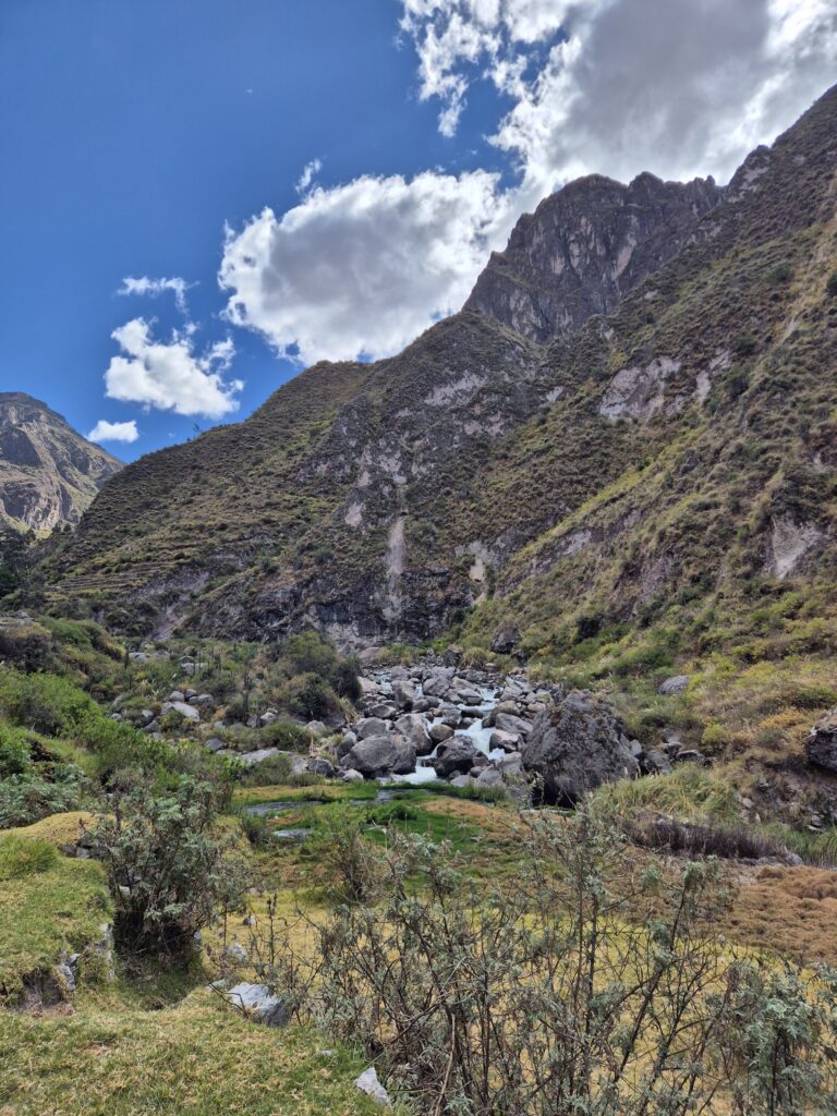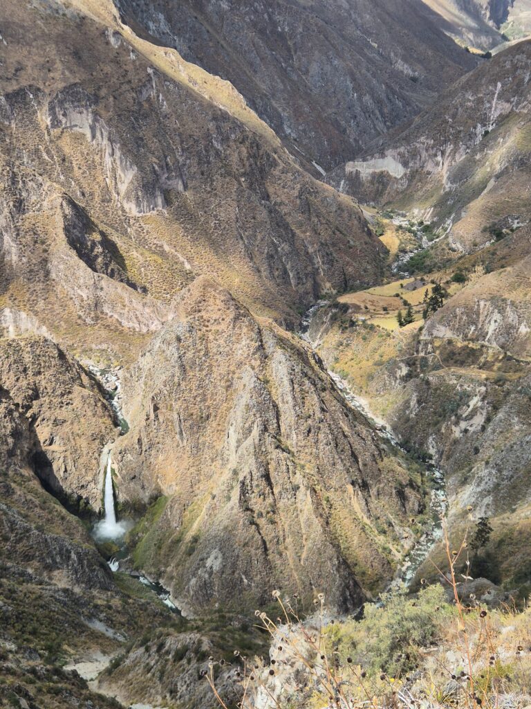 En début d’après-midi, on prend le bus pour Pampamarca depuis le terminal (10$/p). Il passe dans un vallon de l’autre côté du rio, dessert un petit village puis s’élève très haut au dessus du canyon. Après 2h, on arrive au hameau de Pampamarca. Pas beaucoup de vie, pas vraiment de tienda, pas grand chose pour être honnête ! Direction des bains thermaux publiques où l’on veut passer la nuit. On passe un petit col et la petite cascade de Pata Capilla puis on descend dans le canyon sur l’autre versant jusqu’aux abords du rio.