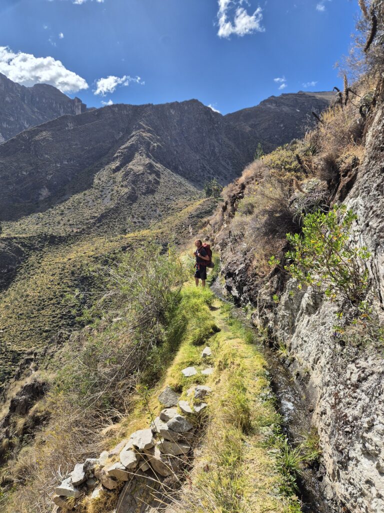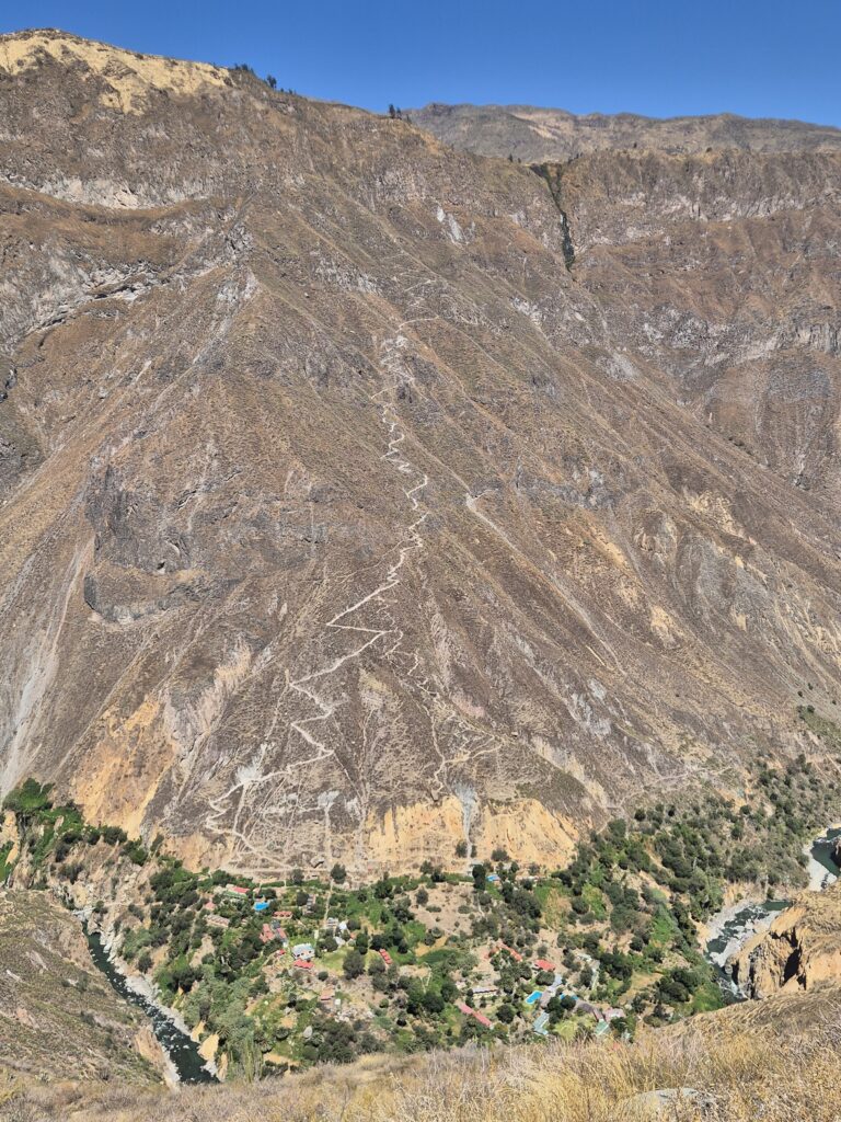 On traverse la rivière puis débute la montée, la longue montée bien raide et sans aucune ombre jusqu’à Cabanaconde. Après la bonne journée de la veille, Camille rechigne à monter, d’autant que John répète bien toutes les 5min qu’il faut se presser pour ne pas rater le bus. On l’a réservé la veillé pour être sûr d’avoir un siège, on ne peut plus reculer.