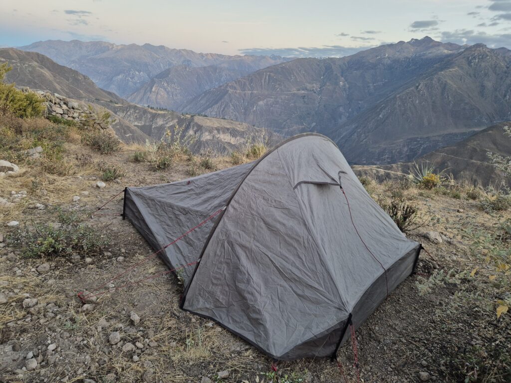 On s’arrête à San Miguel, juste avant Cabanaconde, et on part chercher un bivouac à flanc avec vue sur le canyon. On croise un local qui fait joujou avec son détecteur de métal. Le terrain appartiendrait à son frère, il ne voit pas d’inconvénient à ce qu’on pose une tente dans le coin. L’air se rafraîchit à la tombée de la nuit, mine de rien on est à 3350m. Ce soir c’est sandwich avocat rapide et au dodo.