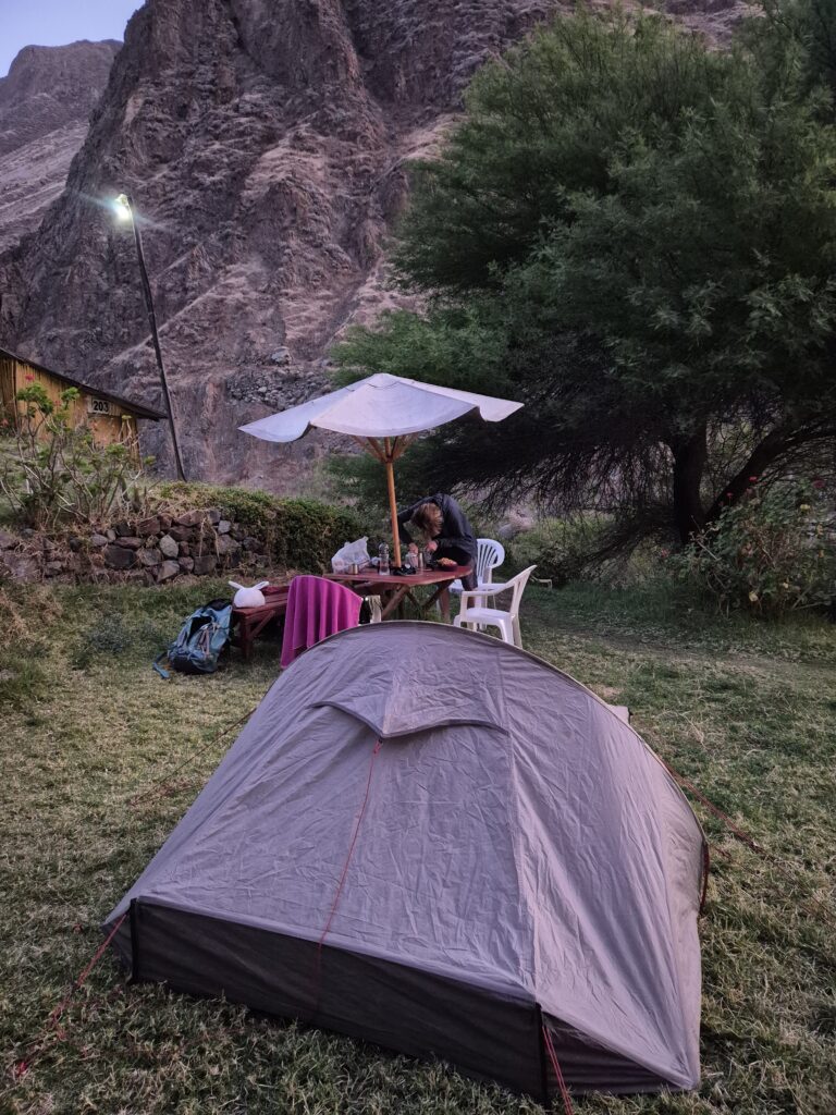 A l’arrivée à Llahuar, ce ne sont que 2-3 bâtiments qui composent le « hameau ». On s’arrête au premier, le Llahuar lodge, et on négocie pour poser la tente à moindre frais. Pour 15s/p, on peut se poser dans la pelouse et profiter du wifi, de la douche et… des sources chaudes !