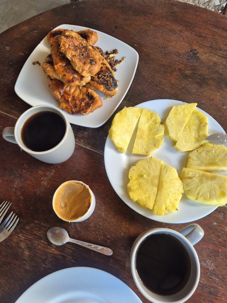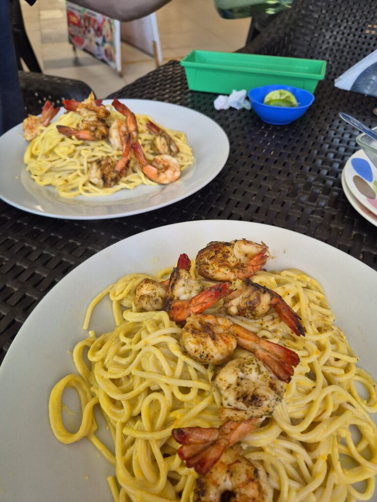 Tandis qu’on récupère des forces avec de beaux pains perdus, seuls dans notre villa, au marché on profite d’une dernière version de la sauce huancaina avec linguines et crevettes. Pour seulement 13s l’almuerzo (un peu négocié), c’est délicieux !
