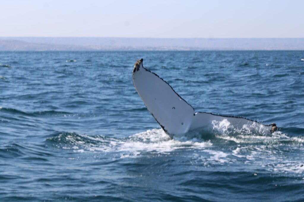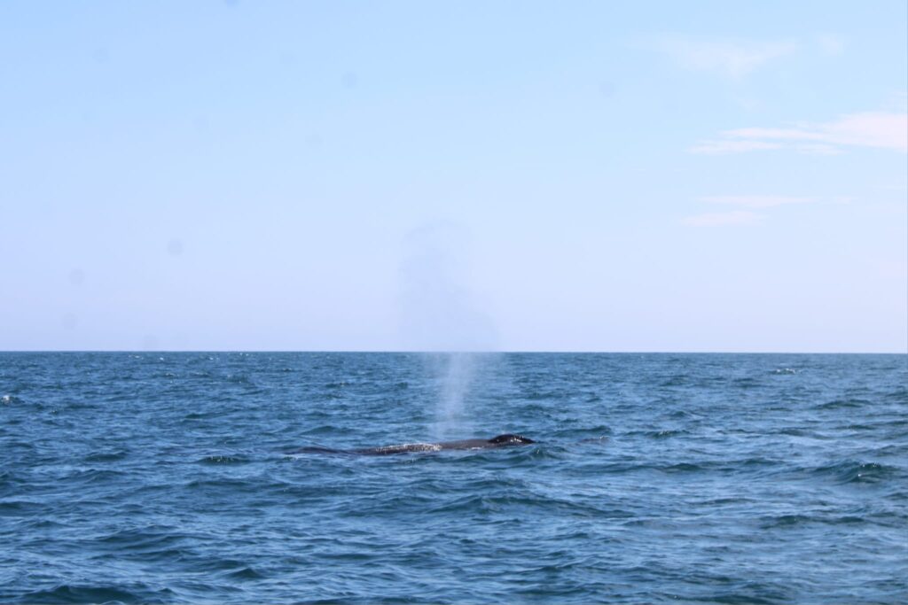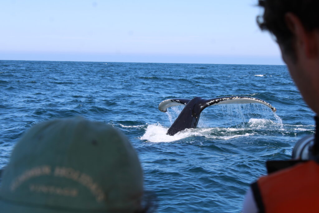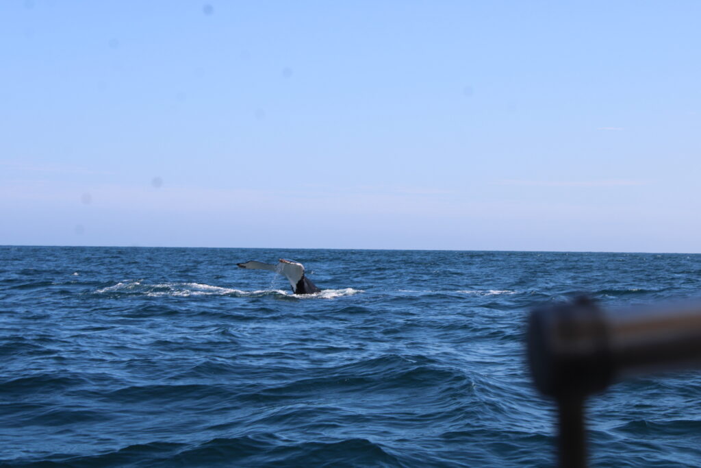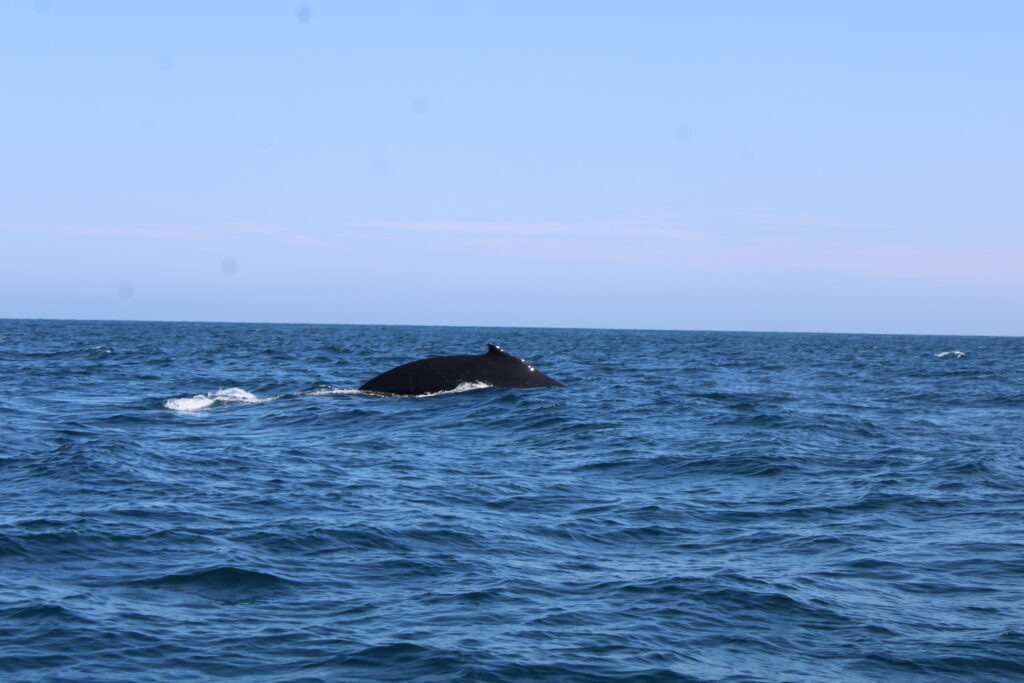 Finalement, alors qu’on s’apprête à repartir, c’est une mère avec son petit qui croisent notre chemin. La femelle attend sans doute que le petit soit plus autonome avant de migrer. Ils jouent autour du bateau, surgissant à droite, gauche, nous gratifiant de quelques levers de queue. Parfois elle nous surprend en passant au ras du bateau, c’est impressionnant !