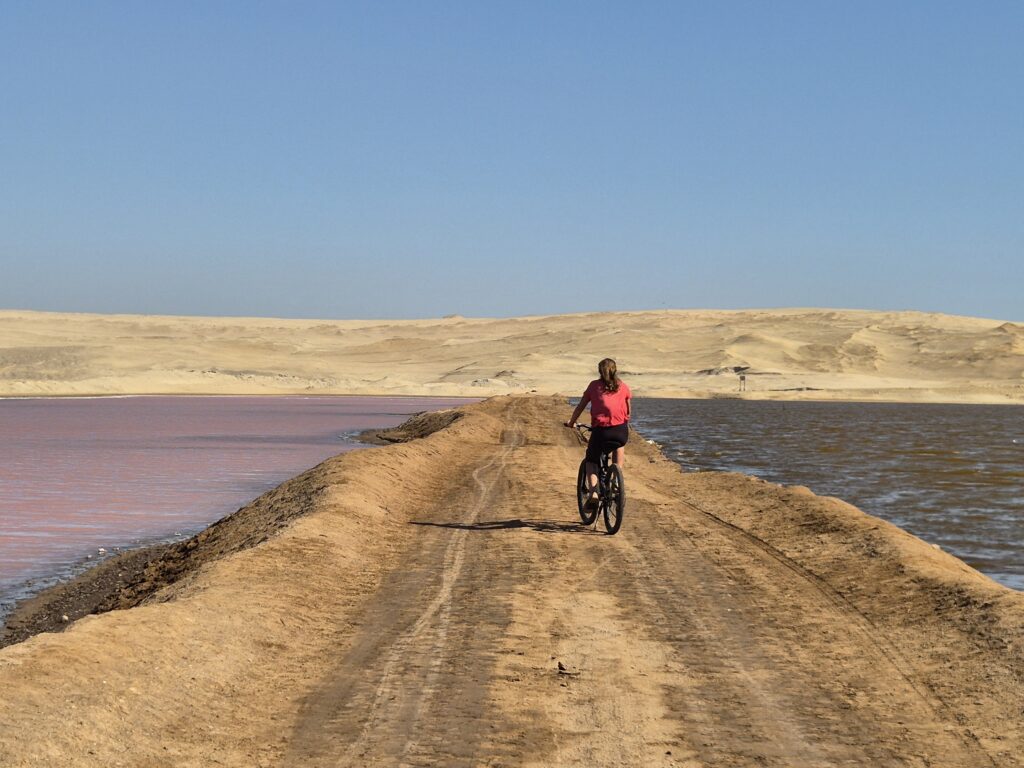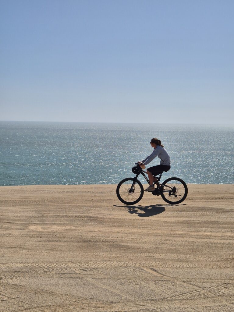 Peu après, on quitte la route principale pour traverser la péninsule et rallier l’autre côte où se situent les principaux points d’intérêt. On a le choix entre la route et une piste qui la suit, dédiée aux vélos. A nouveau, on observe d’immenses plaines désertiques.