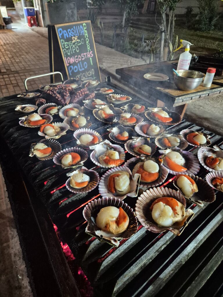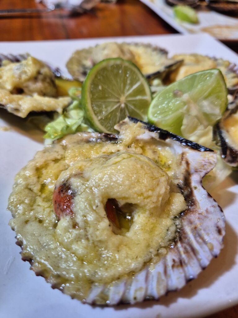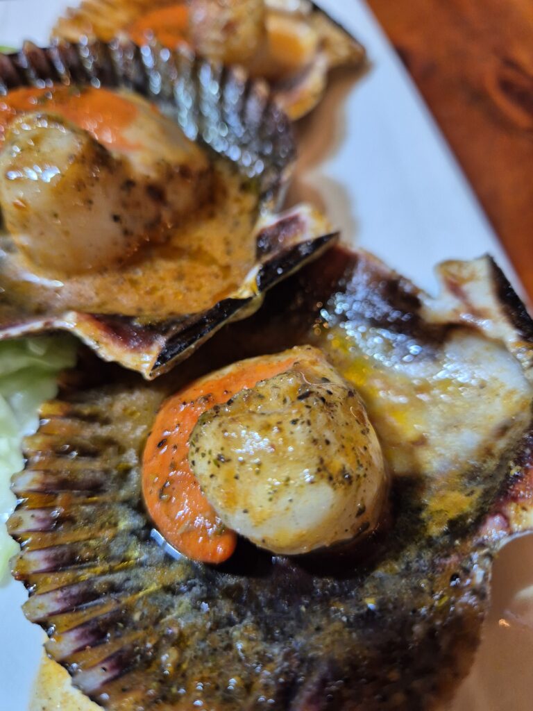 On se fait plaisir et on demande un mixte de conchas (St Jacques), 5 à la plancha et 5 au parmesan (40s les 10). Ensuite Camille partira sur une demi-langouste au barbecue quand John prendra les tentacules de poulpe (45-50s le plat).