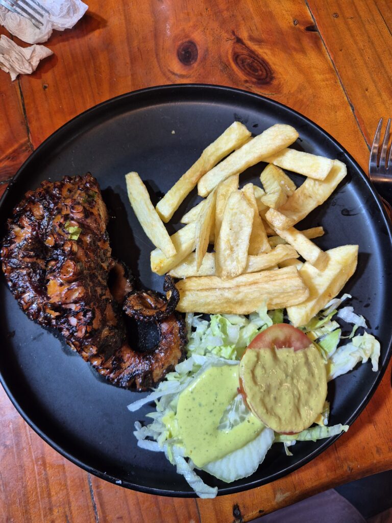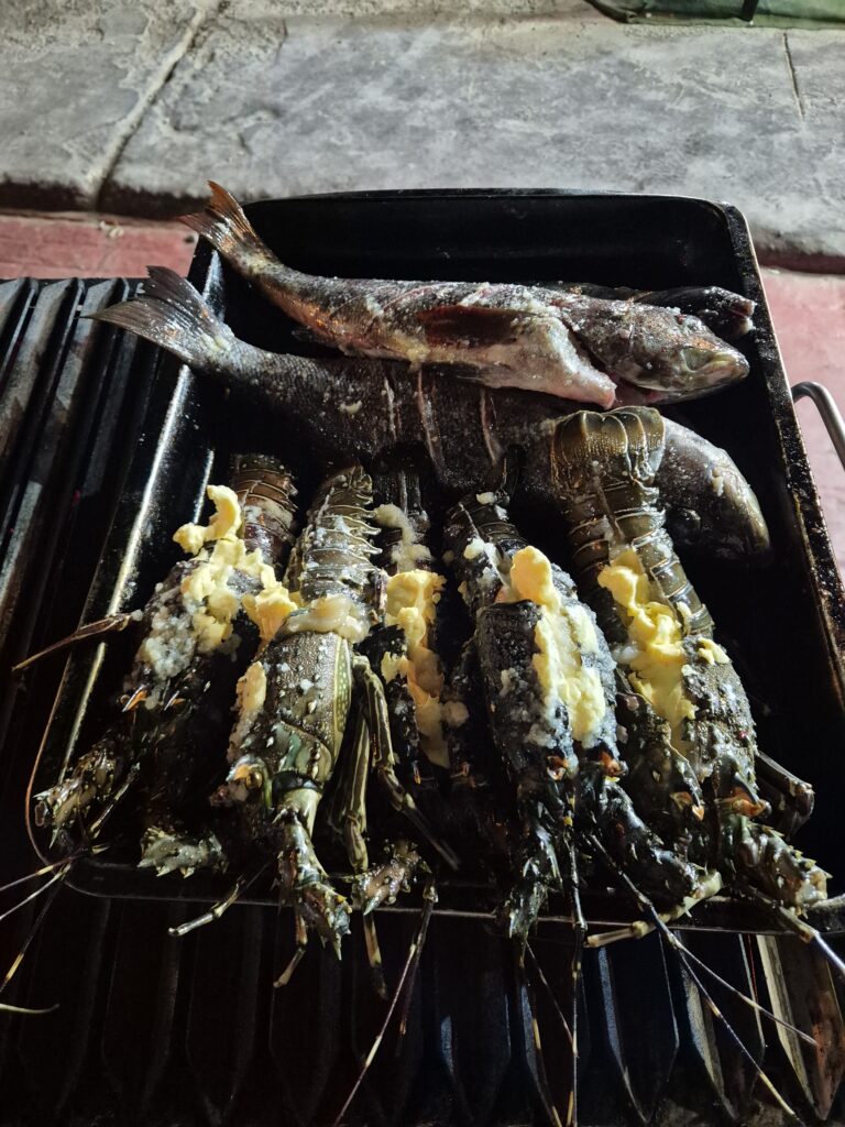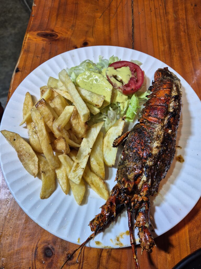 Enfin le second jour, après une bonne journée dans la réserve, on s’arrête à un boui-boui vers la plage, dont le barbecue et tous les produits frais sur le comptoir ont attisé nos papilles. Poulpe, crevettes, poissons, saint-jacques et surtout, langoustes sont présents sur l’étal.