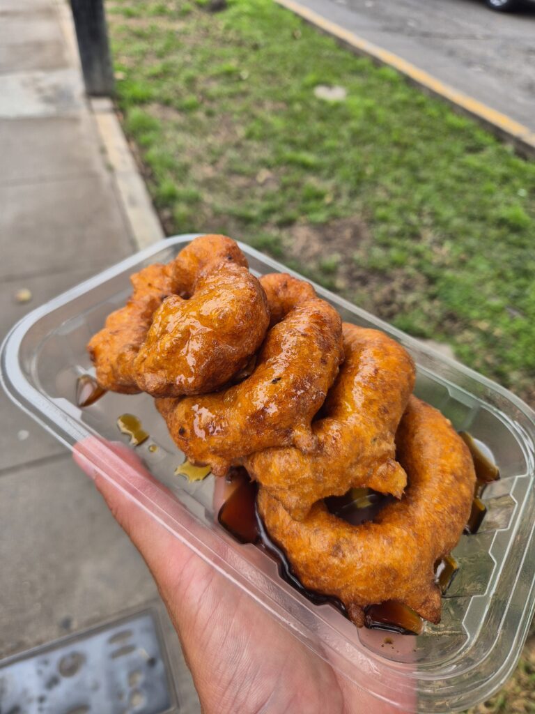 On a coché quelques points d’intérêt sur la carte, l’idée c’est de marcher entre chacun de ces points et de se laisser porter, en passant par les différents parcs. On grignote quelques picarones en chemin, des beignets de courge/patate douce accompagnés d’une sauce très sucrée.