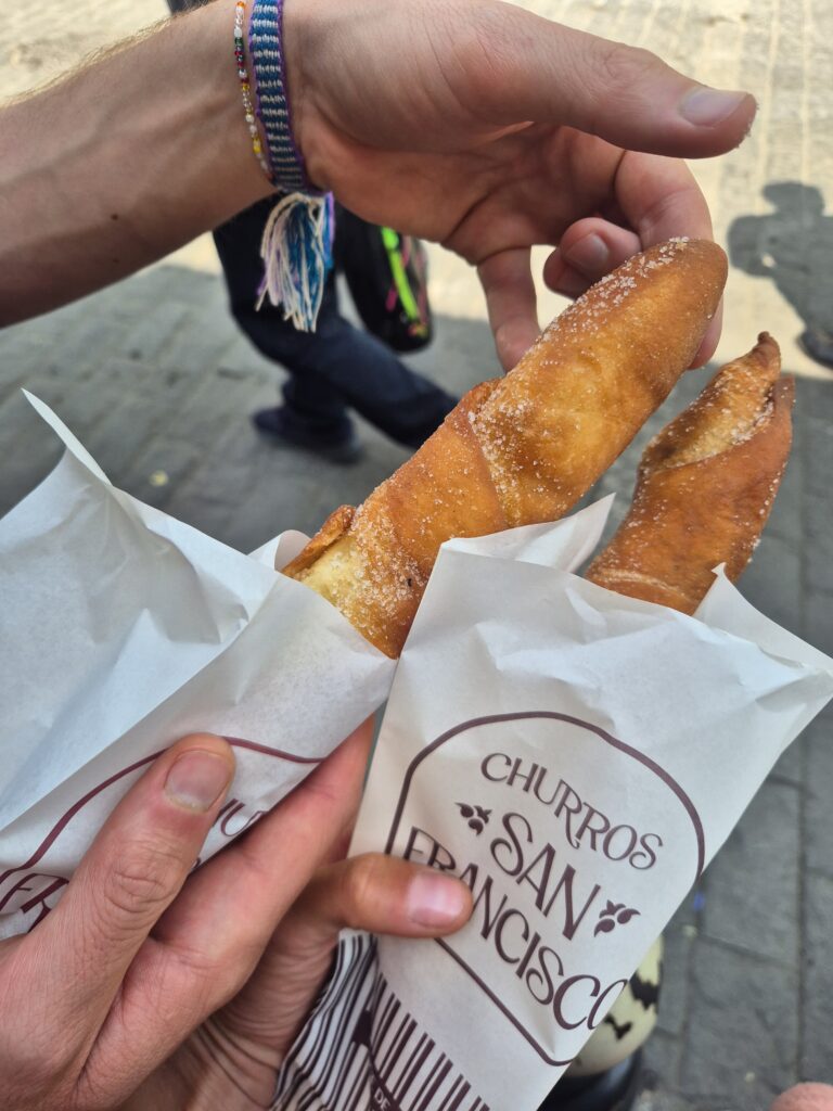 On poursuit vers la place centrale, observant plusieurs grands et vieux bâtiments historiques. Et on tombe sur les célèbres churros San Francisco. Pour 3,5s, on reçoit un long beignet fourré de manjar, chocolat ou crème pâtissière. John en reprend un par gourmandise, et se plaindre ensuite d’avoir trop mangé.