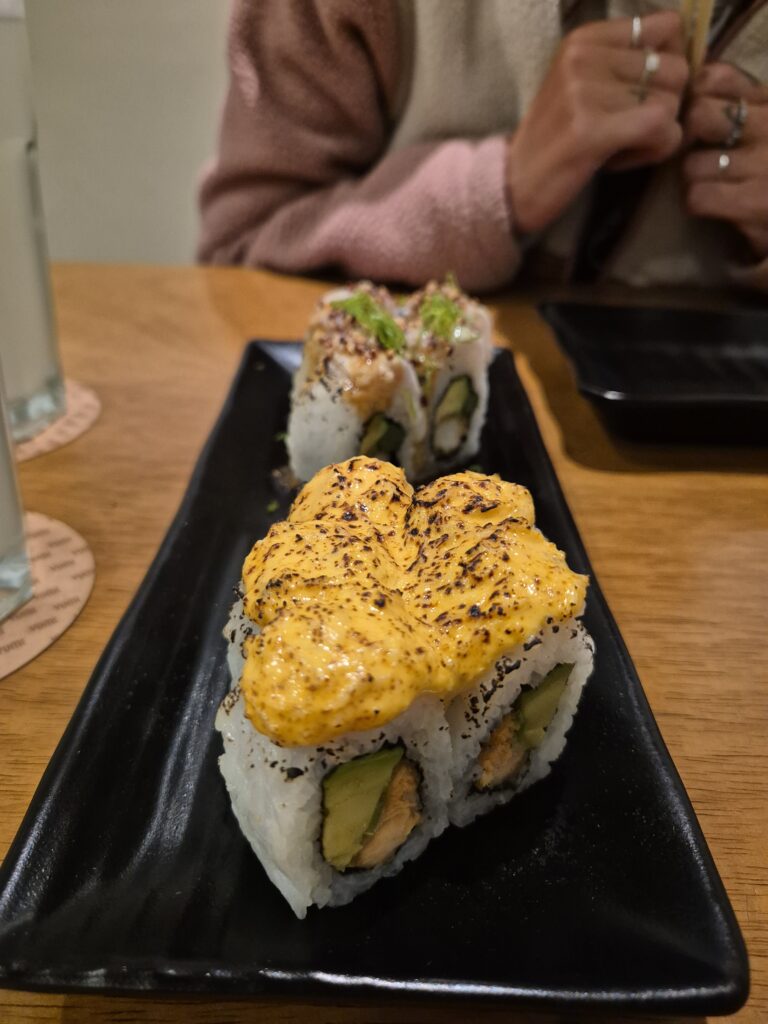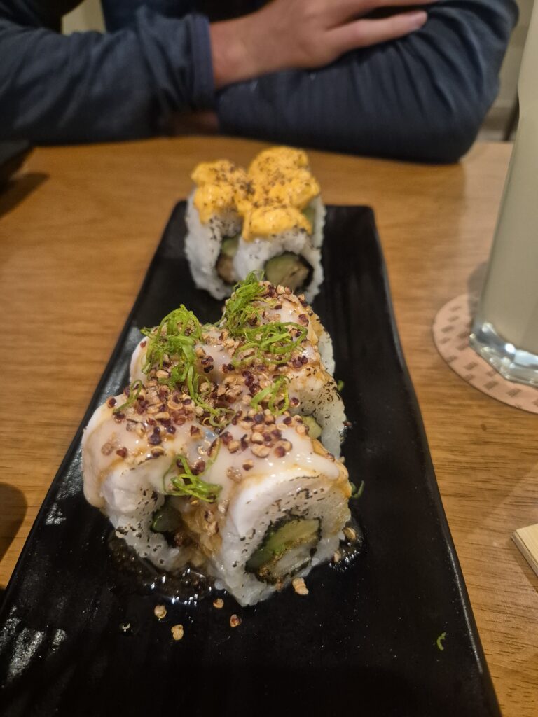 Une bonne manière de le découvrir, relativement accessible, c’est par le biais d’un restaurant à sushi. On cherche brièvement une adresse autour et on finit à Yume. Pour 100s, on peut choisir 5 pièces (makis) de 4 recettes différentes. Modestes amateurs de sushis/makis, ce sont certainement les meilleurs qu’on ait mangés. Fromage frais flambé, sauce huitres, sauce maracuya, morceaux de crevettes panées épicées… C’est une belle revisite et d’intéressants mélanges de textures et saveurs.