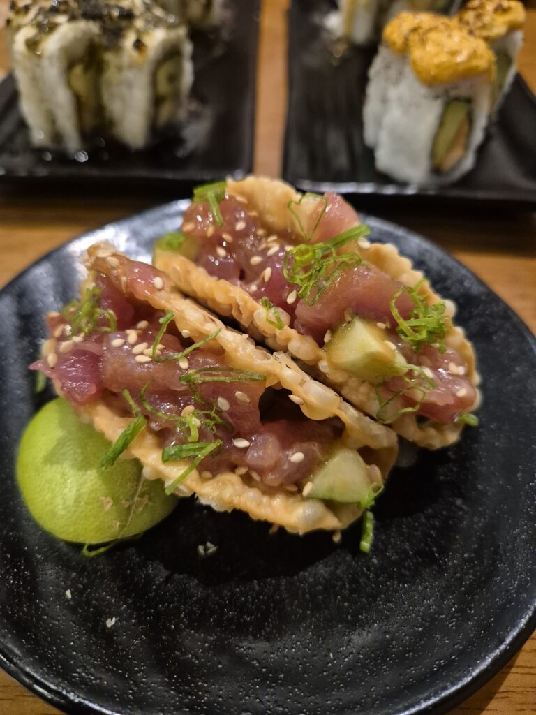 Les makis sont accompagnés de riz frit (yakimeshi) et 2 tacos katsuo, à nouveau un exemple de fusion culinaire avec un taco croustillant garni de thon et relevé par de curieux assaisonnements.