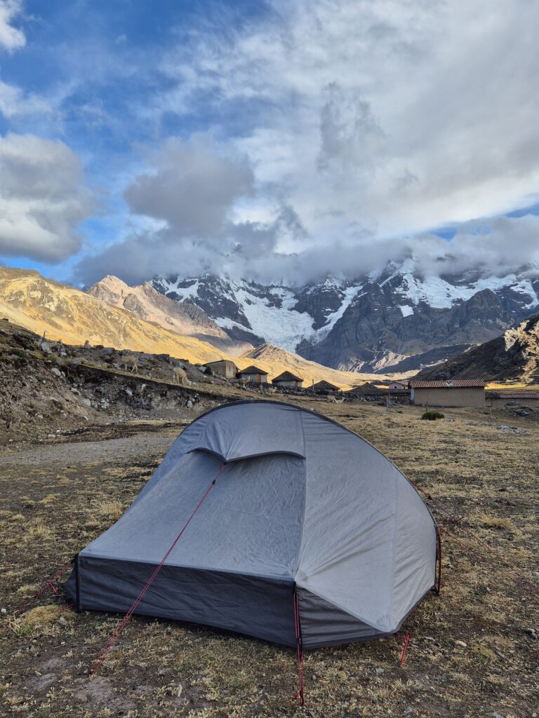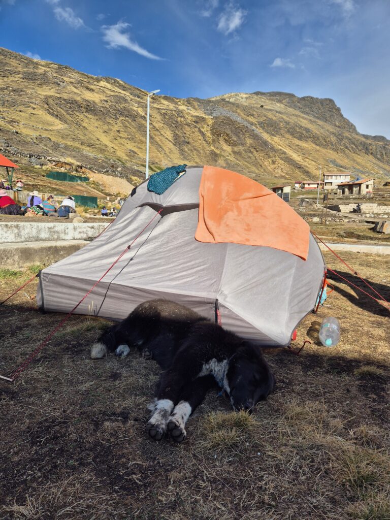 Lorsqu’on parvient à Anantapata, nous sommes bloqués par un homme de la communauté qui nous demande un droit de passage. Même si nous ne souhaitons pas camper ici, il ne nous laissera pas passer sans paiement. Et bien sûr, il a préparé son petit tas de jolis tickets. Difficile de dire si tout cela est légal, après tout qu’est-ce que la légalité dans un coin perdu du Pérou ? Bref, on laisse traîner, on montre que nous ne sommes pas hyper enclins à payer, et de lui-même, l’homme nous propose de ne régler qu’un seul ticket pour 2, soit 20s en tout. Quitte à payer un campement, autant en profiter. Camille est éreintée et le temps commence à se gâter. On met rapidement la tente avant que la pluie ne commence et on s’abrite comme on peut sous le (bord du) toit du refuge.