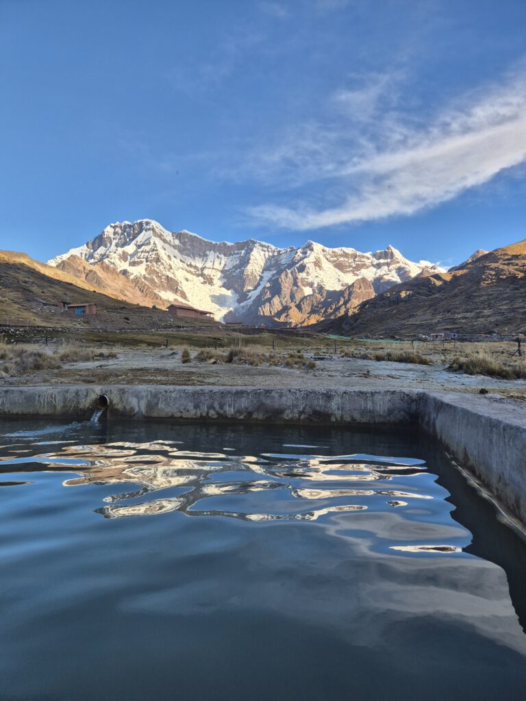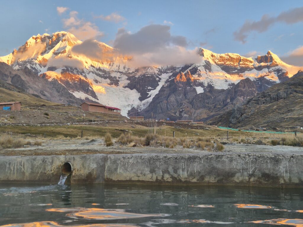 Il semble y en avoir plusieurs dans le village. Les nôtres sont rustiques mais parfaits. L’eau est limpide, on peut s’asseoir à l’intérieur, et les vues sont formidables. Face à nous, l’imposant Ausangate, notre compagnon pour les 5 prochains jours. On quitte les thermes à la tombée de la nuit, ce soir on a la chance d’avoir un abri pour cuisiner « au chaud ». Première tambouille de pâtes en crème d’asperges et on se réfugie dans notre tente.