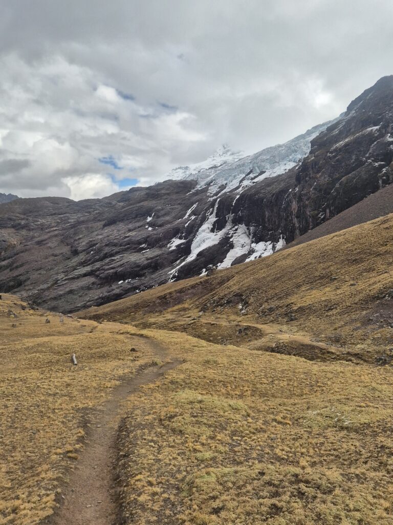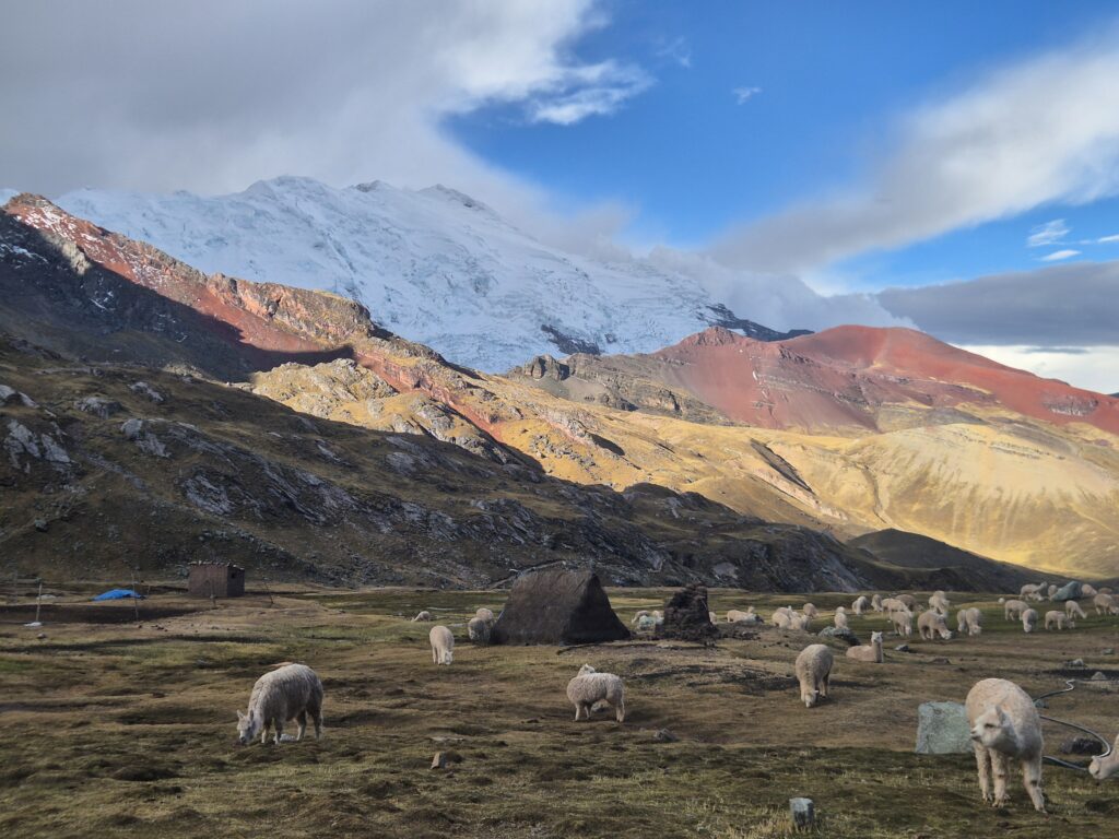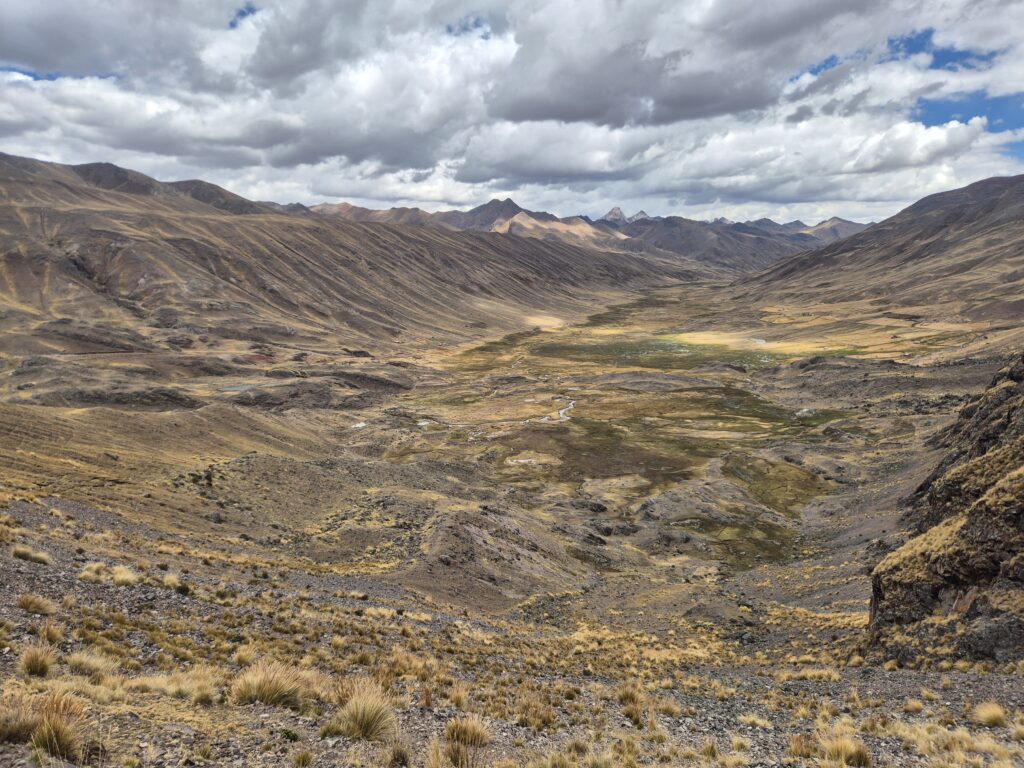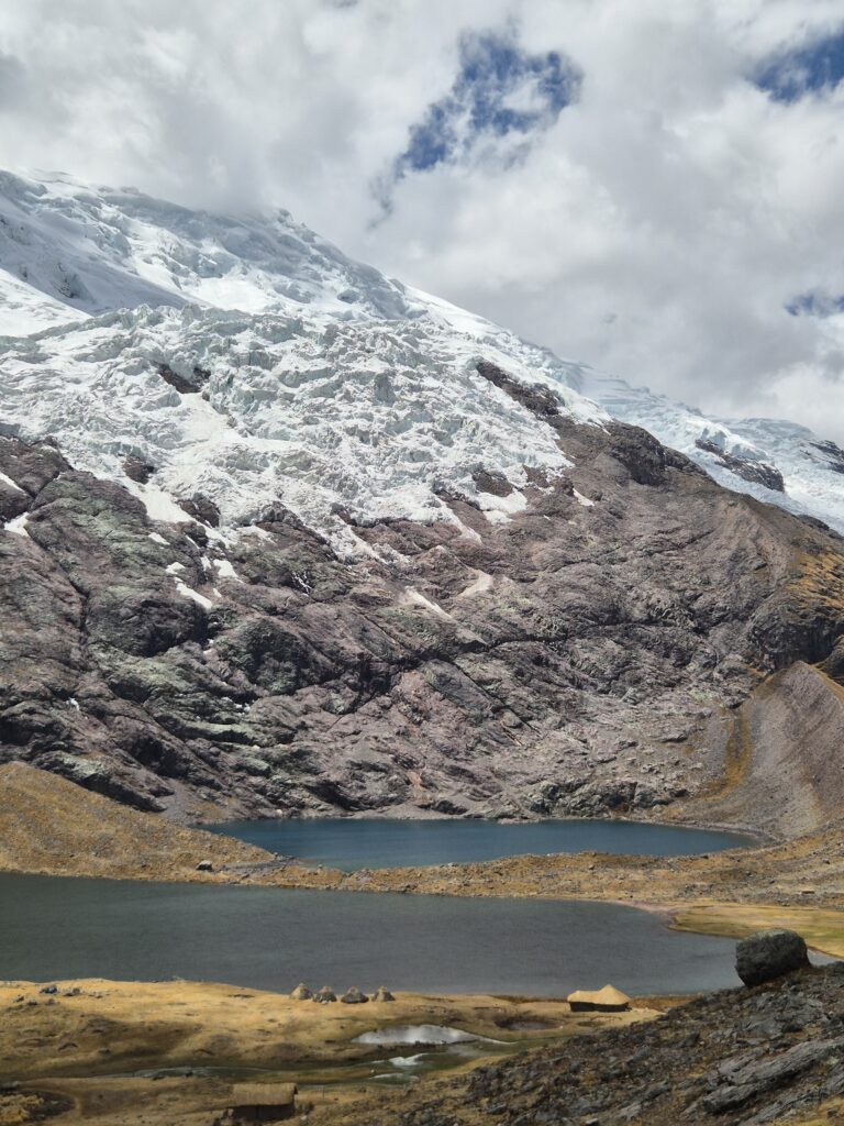 On contourne la montagne et redescend dans une petite vallée parsemée de grands lacs. Là-haut, les immenses glaciers de l’Ausangate commencent à se découvrir et ne nous quitteront plus. On prend l’itinéraire, pas toujours clair, qui longe les lagunes et rejoint le sentier principal au niveau des huttes indiquées comme « free » par OSM. En réalité ces huttes sont utilisées par les locaux pour conserver le bois ou la laine au sec et vous aurez sûrement une visite d’un local réclamant son dû en cas d’utilisation.