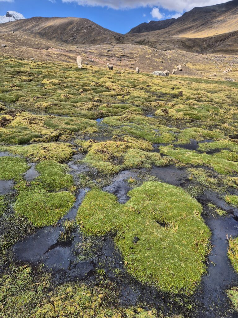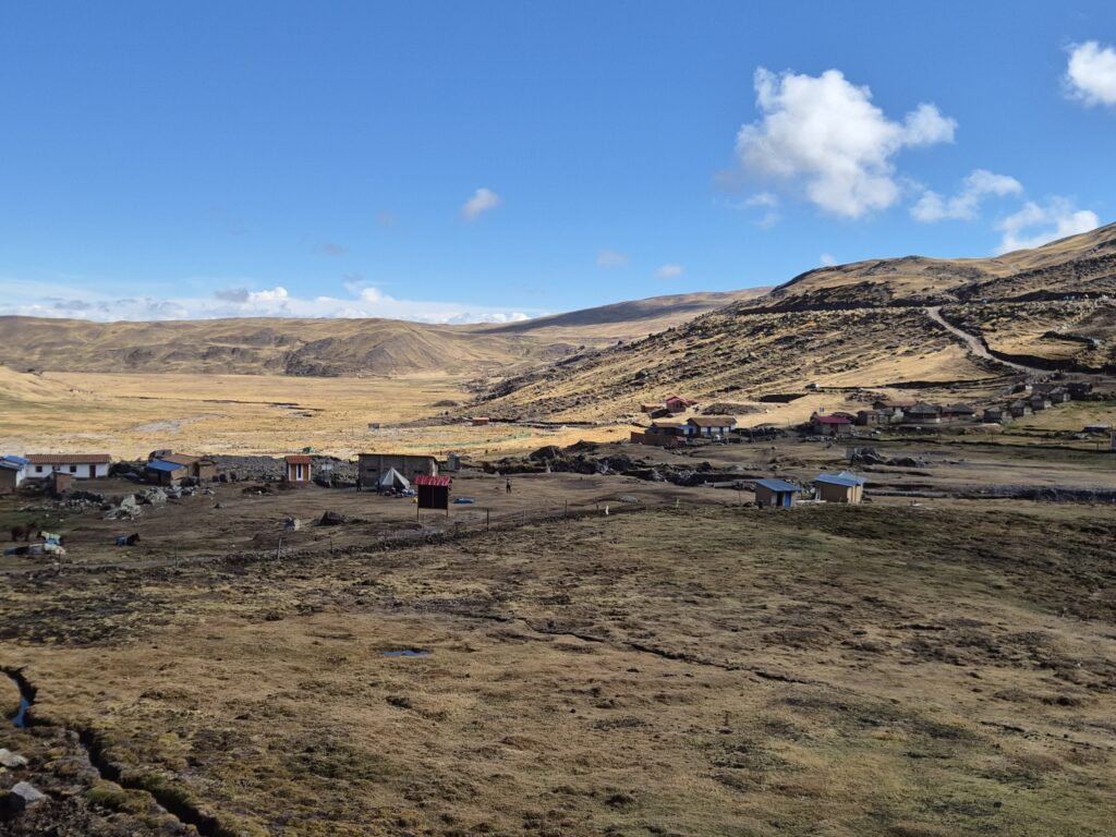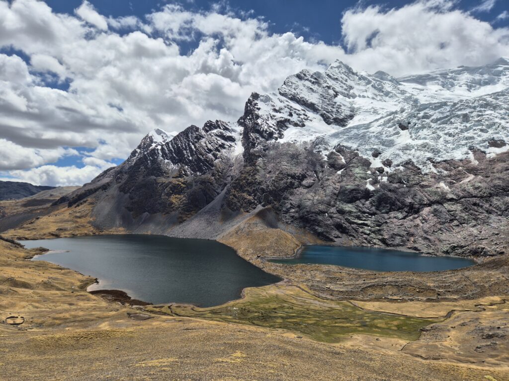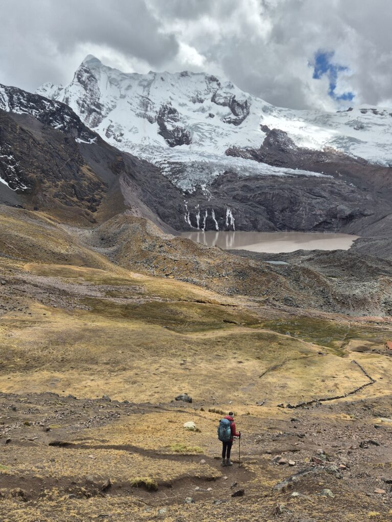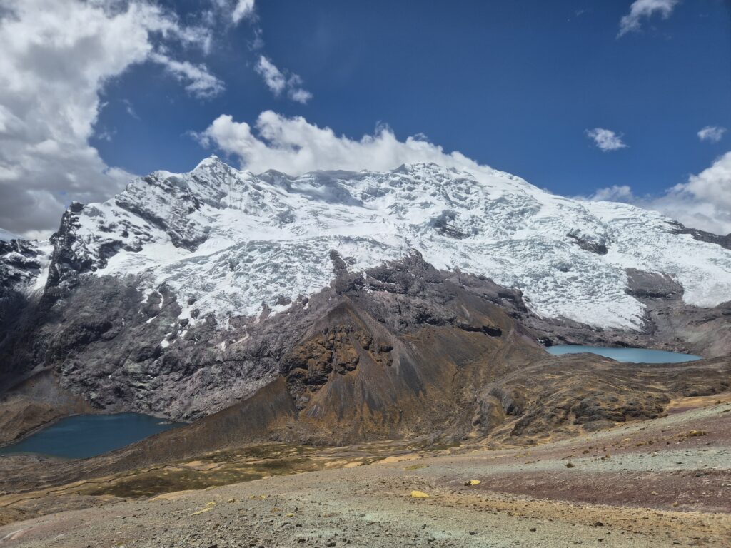 On contourne la montagne et redescend dans une petite vallée parsemée de grands lacs. Là-haut, les immenses glaciers de l’Ausangate commencent à se découvrir et ne nous quitteront plus. On prend l’itinéraire, pas toujours clair, qui longe les lagunes et rejoint le sentier principal au niveau des huttes indiquées comme « free » par OSM. En réalité ces huttes sont utilisées par les locaux pour conserver le bois ou la laine au sec et vous aurez sûrement une visite d’un local réclamant son dû en cas d’utilisation.