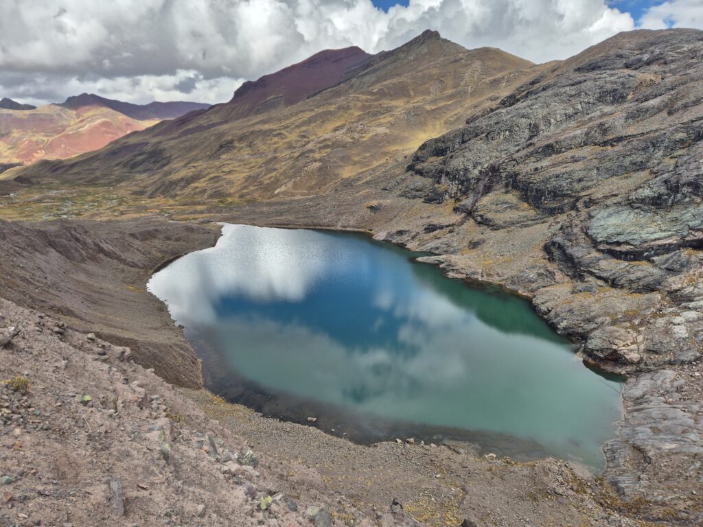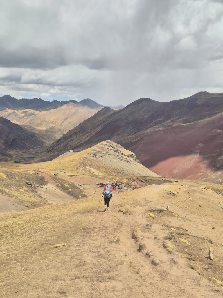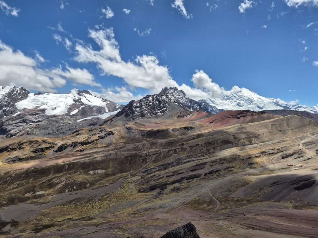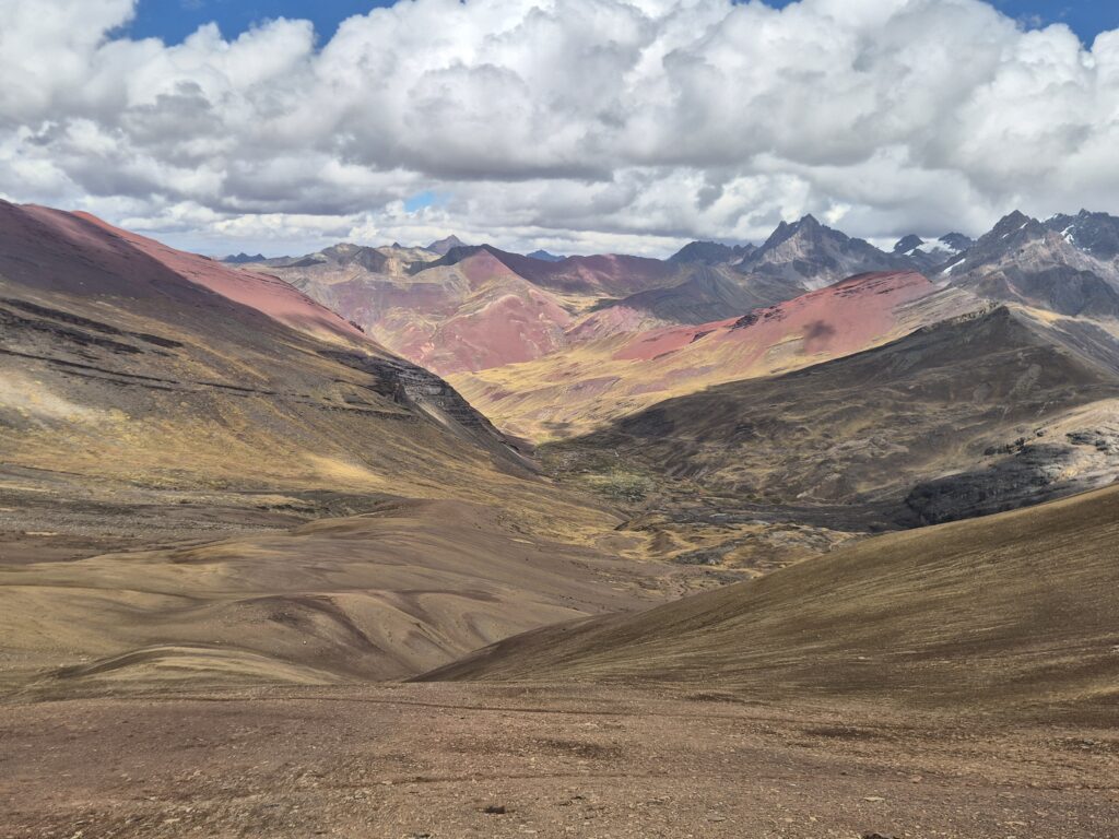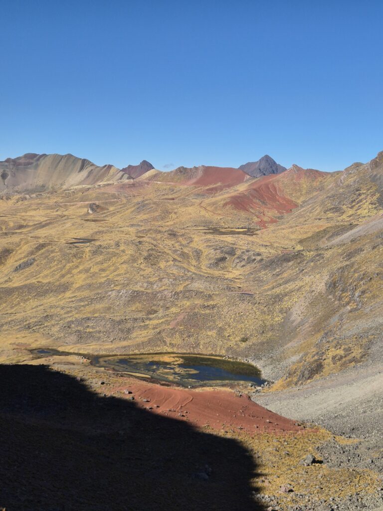 Du col on peut apercevoir au loin Vinicunca. Entre les montagnes, petites lagunes et vallées colorées, c’est un superbe décor qui s’offre à nous.