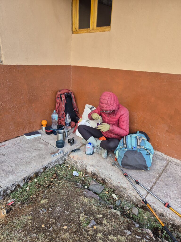 Il a fait très froid cette nuit, et la neige a complètement gelé. Ce sont de véritables séracs que l’on retire de la tente en tapotant avec les bâtons de rando. En outre, les chiens des villageois ont aboyé toute la nuit… On fait les cent pas pour se réchauffer en attendant le café et, accessoirement, le soleil. Il n’a pas l’air de se montrer, le temps est assez nuageux alors on prend rapidement la route du paso Palomani. Rien de mieux qu’un col à 5200m pour bien commencer une journée !