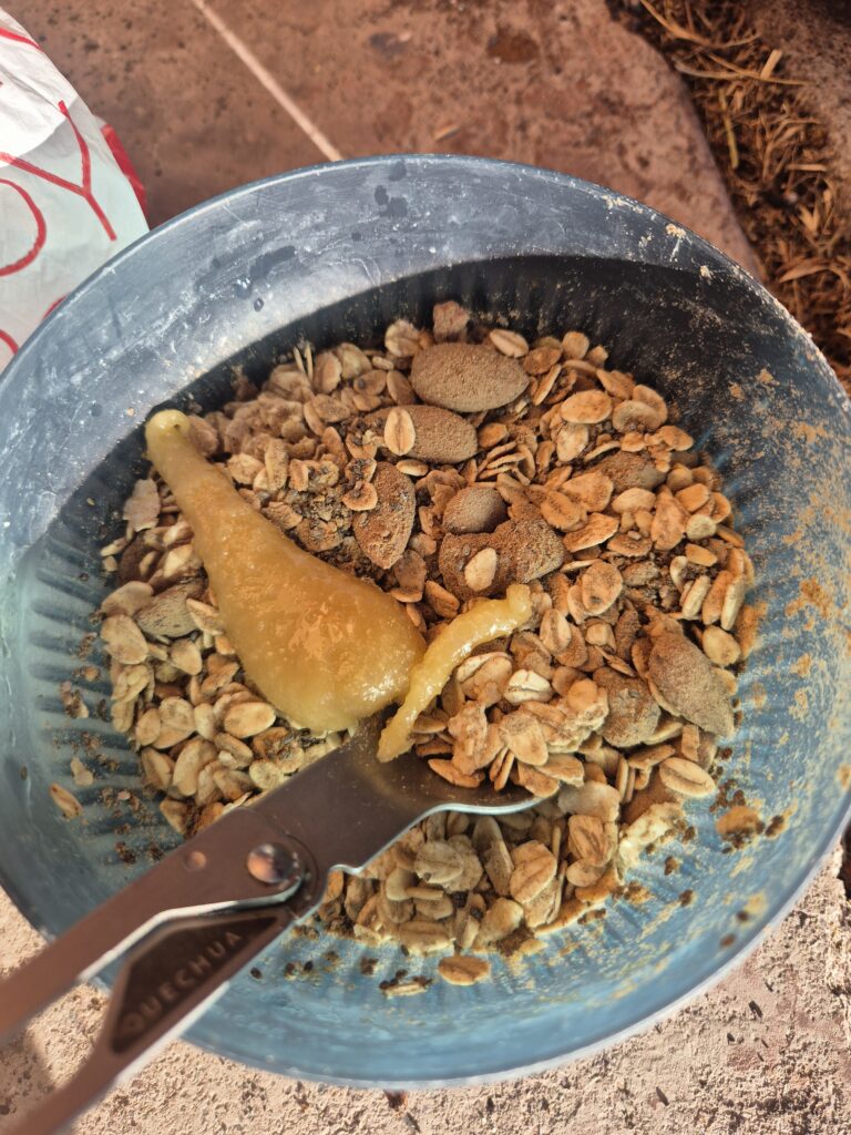 On a la chance de profiter d’un intérieur pour le petit déjeuner, ce ne sera pas la même pour les prochains jours. Recette classique, un café bien chaud et un mélange d’avoine et graines locales.