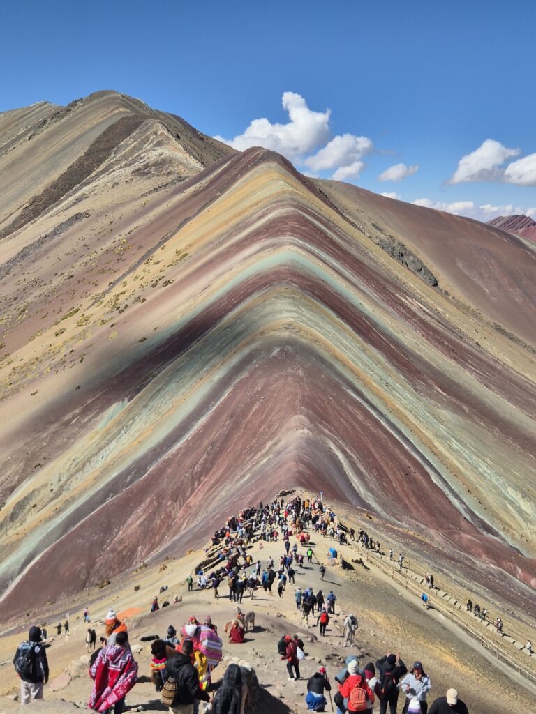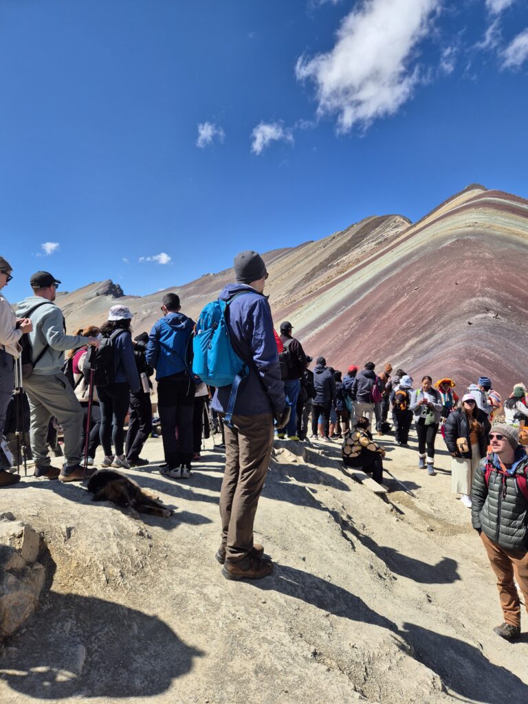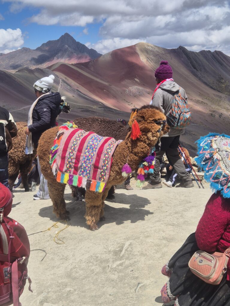 Il doit être 9h, il y a déjà foule. Une queue commence à se former pour la partie basse afin de se prendre en photo au pied de la fameuse montagne, en réalité une petite colline. Au milieu de pauvres alpagas sont revêtus d’habits traditionnels et de lunettes de soleil pour satisfaire les Insta des touristes. Nous préférons la partie haute du mirador, qui permet d’observer le lieu un peu plus tranquillement.