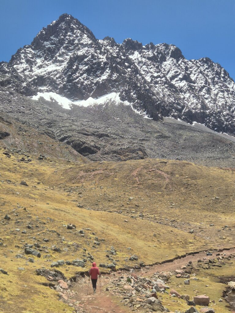 Il y a quelques spots de bivouac possibles dans la montée, pas mal de zones herbeuses, on aurait dû continuer et dormir par là. Déjà on n’aurait pas payé le campement et on aurait sans doute eu moins de bruit… John rumine seul dans son coin. Finalement la montée est plutôt douce, on profite de jolies vues sur les montagnes rouges de la veille et bien sûr les beaux glaciers de l’Ausangate.