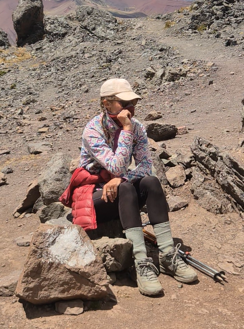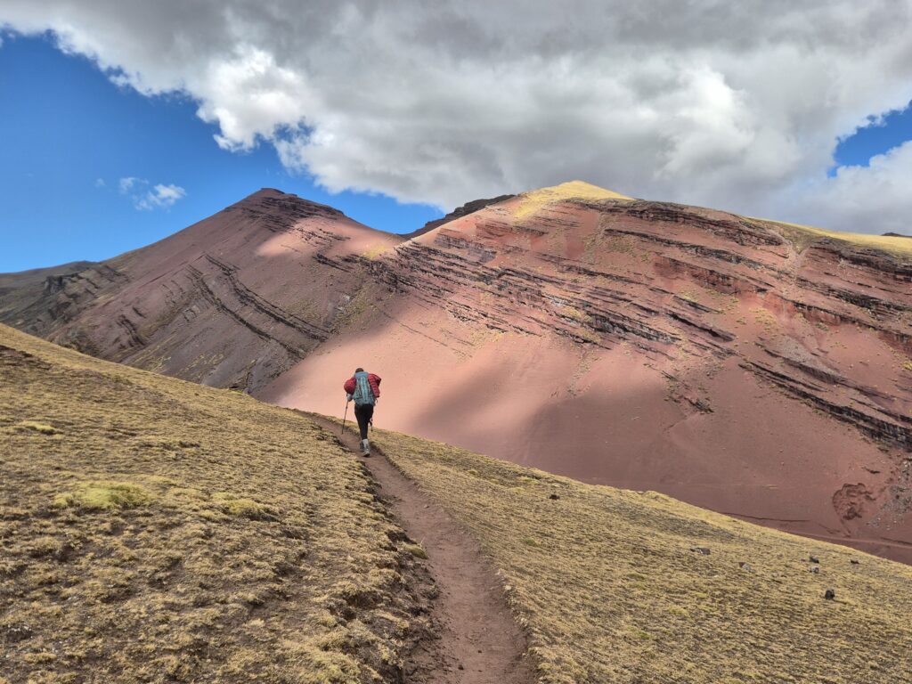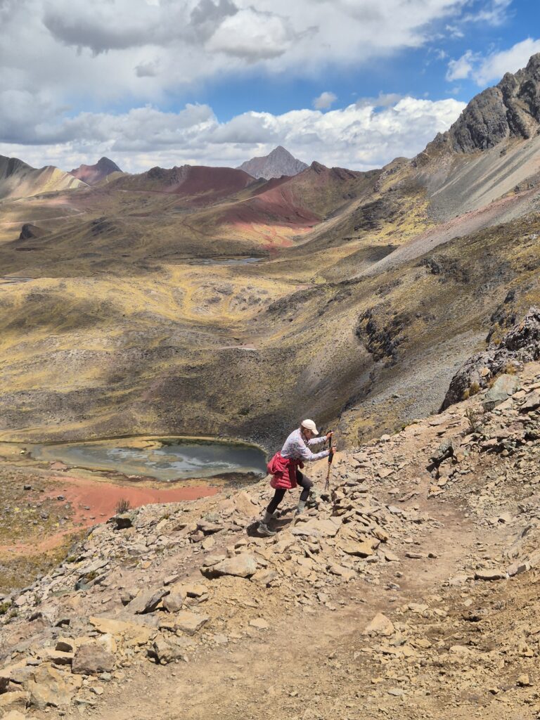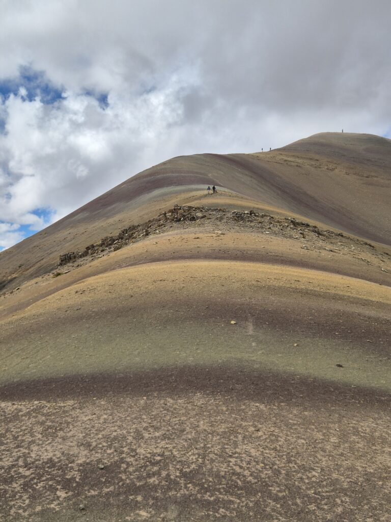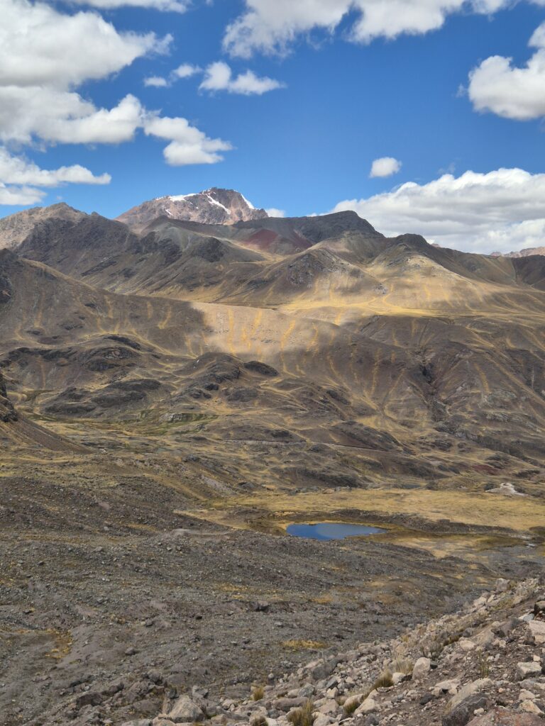 C’est parti pour un nouveau col. 2 chemins possibles : Camille prend celui qui serpente pendant que John choisit le tout droit. Le col est superbe avec des vues sur l’Ausangate au loin, le Takusiri et sa belle lagune, et… une véritable colline colorée.