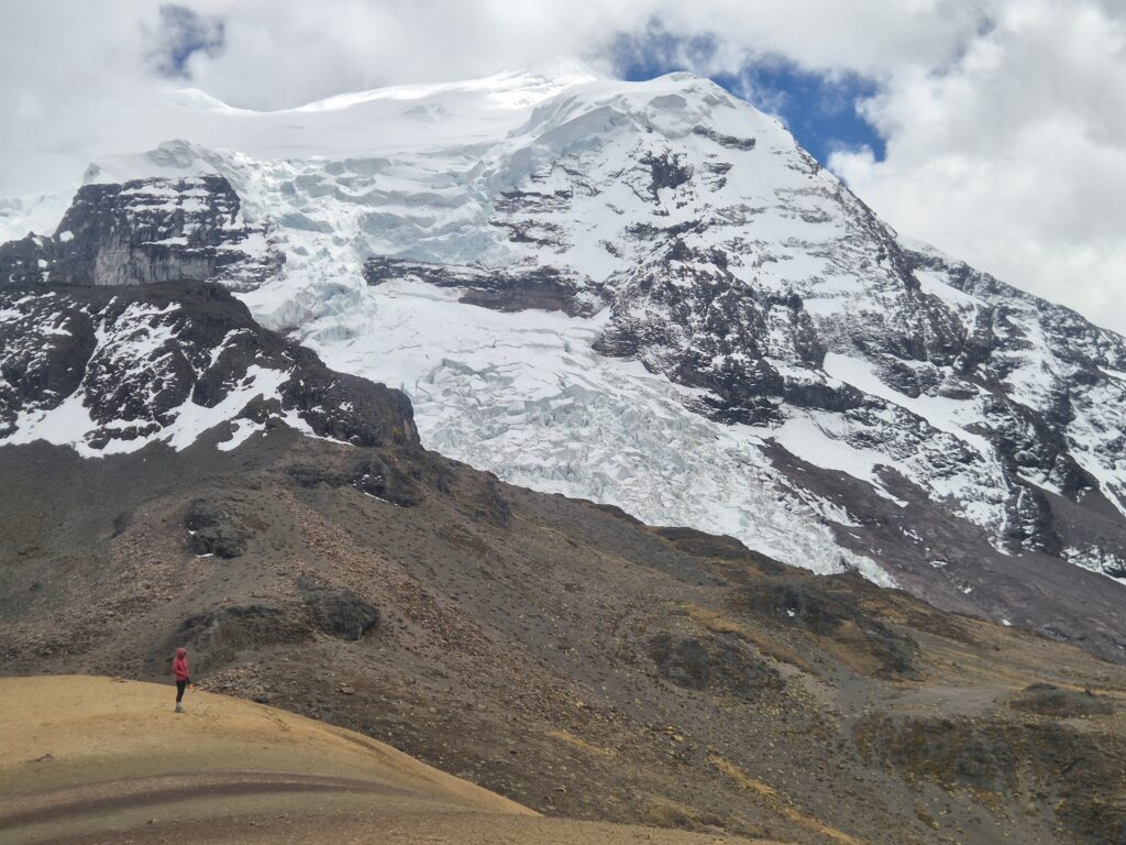 On poursuit en direction du paso Arapa. Le temps est brumeux et les glaciers ne se laissent que partiellement entrevoir, mais les vues sont déjà très agréables. Quelques montagnes aux teintes colorées viennent compléter le tableau d’un premier col à 4753m. Camille sent déjà que ses jambes sont molles, sans doute le contrecoup du Choquequirao il y a peu, sans oublier l’altitude nettement plus élevée.