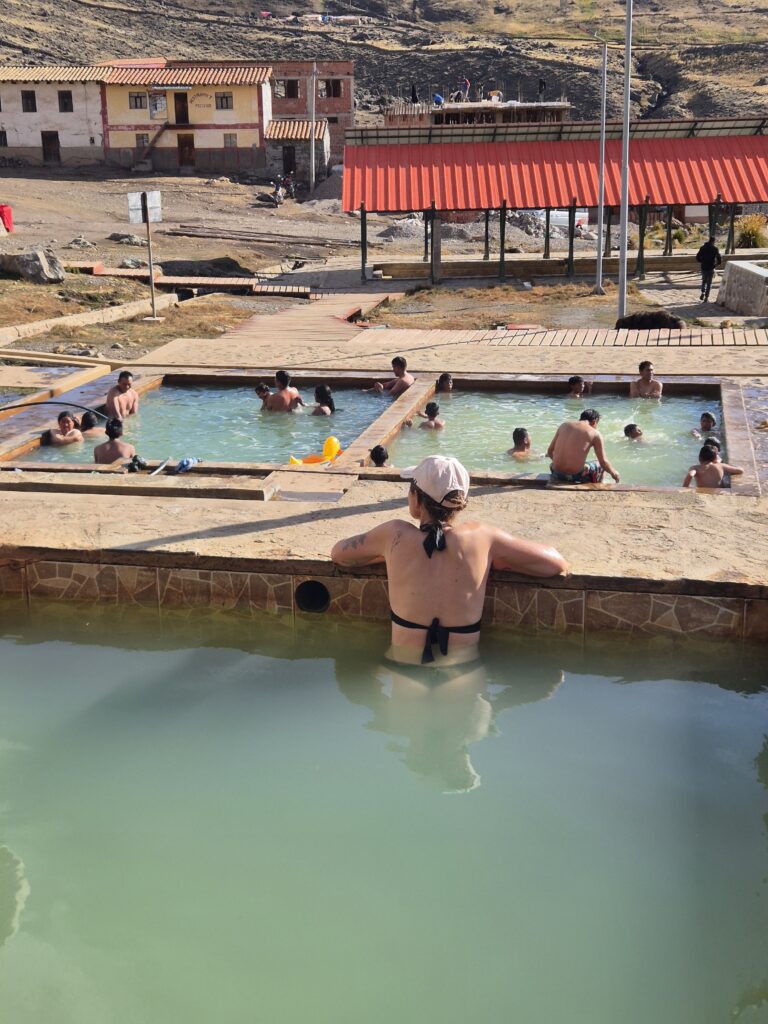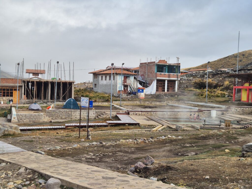 On termine par un chemin rocailleux jusqu’à Pacchanta, où l’objectif est de trouver un spot pour planter la tente avant de se détendre aux thermes. Un panneau semble indiquer une zone de camping à proximité des bassins thermaux mais personne ne semble au courant. Finalement on demande à un resto à côté. « 10 soles » nous dit le proprio. On tente 5. « Ok », adjugé. On aurait posé la tente sans rien dire, probablement personne ne serait venu s’en plaindre. Le terrain est éclaté, des chiens tournent autour, et les gamins courent au milieu. 5s c’est déjà cher pour ce que c’est.