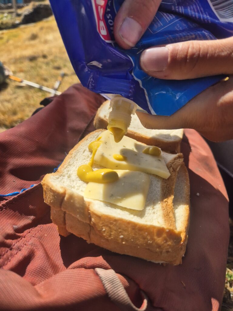 - Déjeuner : on achètera un peu de pain pour les 2 premiers jours et on enchaînera sur du pain de mie, que John compresse au maximum pour gagner en volume. Un peu de fromage du marché (celui à l’origan est vraiment pas mal !) sous vide, un peu de moutarde pour un semblant de goût, et le tour est joué.