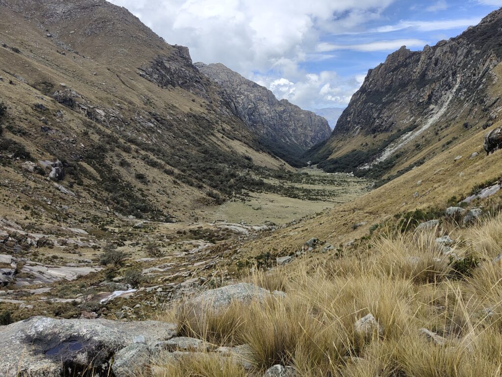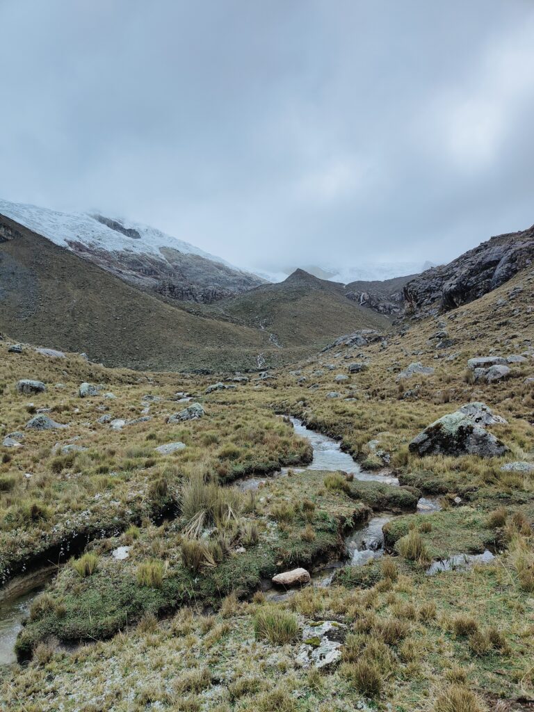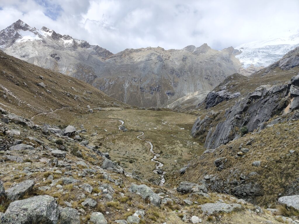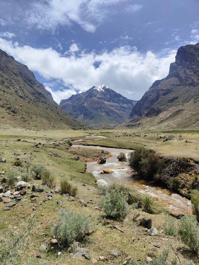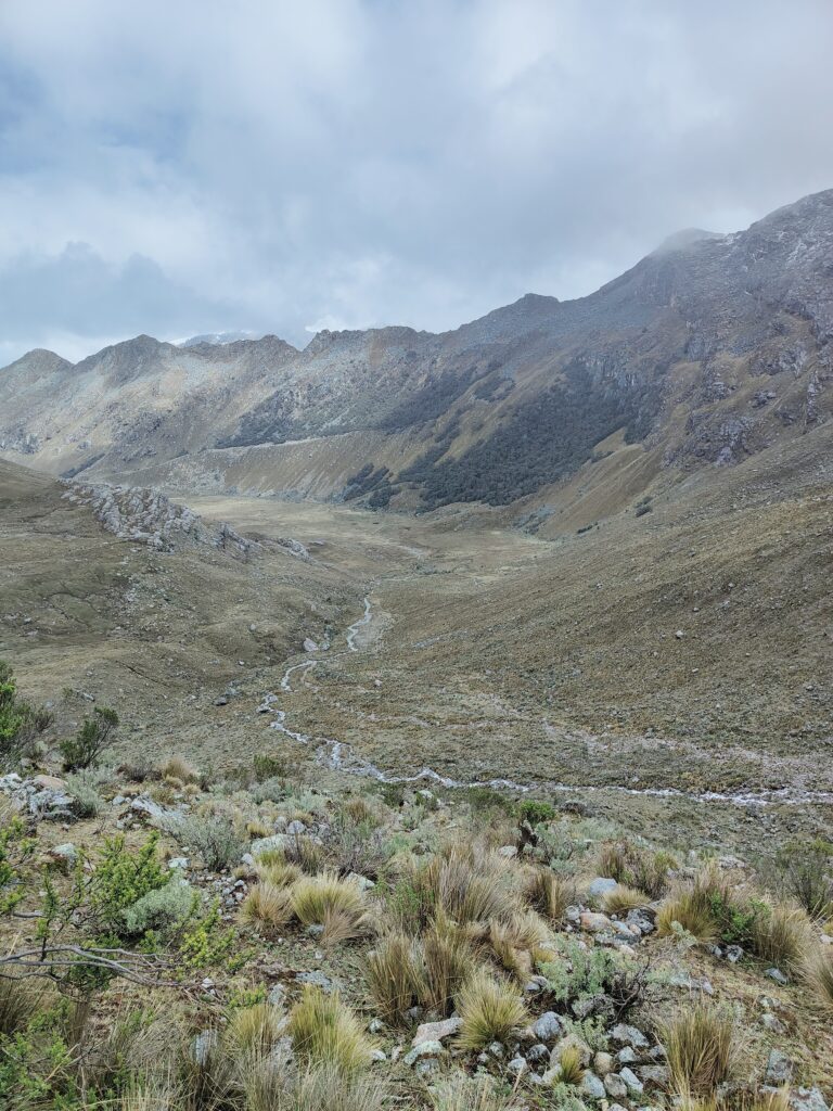 Le sentier est très roulant dans la vallée, et très simple à suivre. Je retrouve enfin des vrais ponts pour traverser les rivières, plus besoin de risquer son sac à chaque passage de torrent comme au Huayhuash. Je profite d’une collation à base de beurre de mani (cacahuète) alors que le ciel se couvre et que les premières pluies s’abattent sur les montagnes orientales.