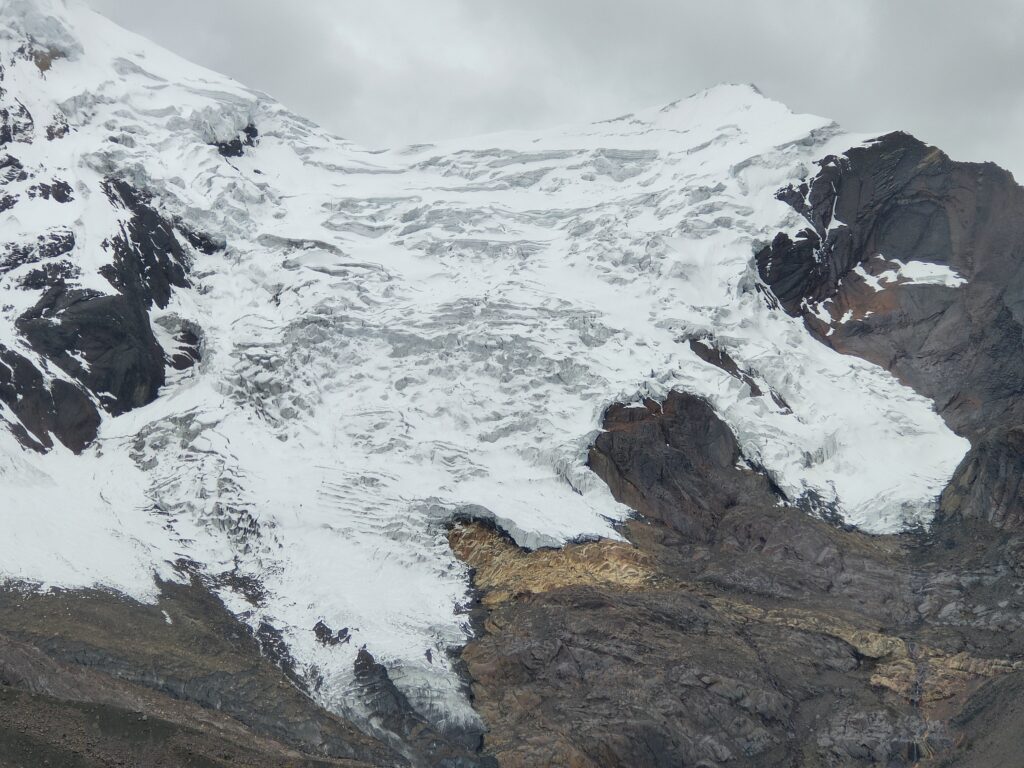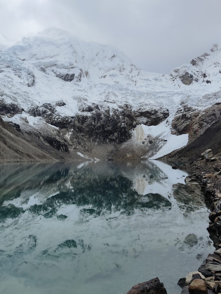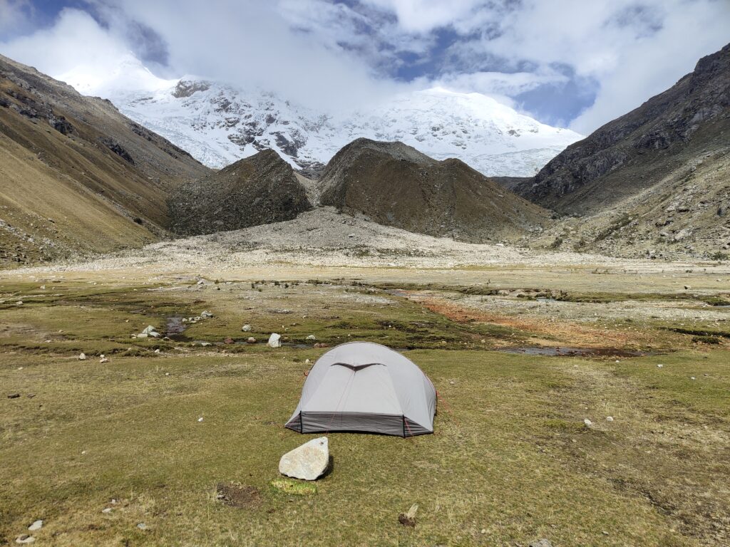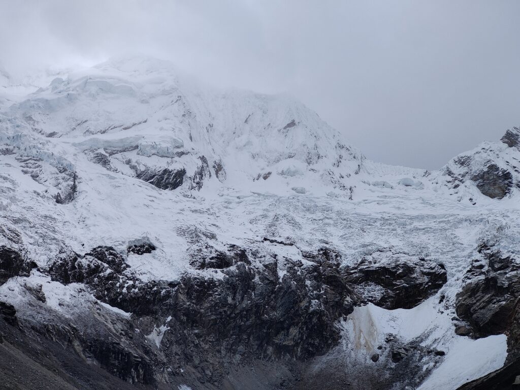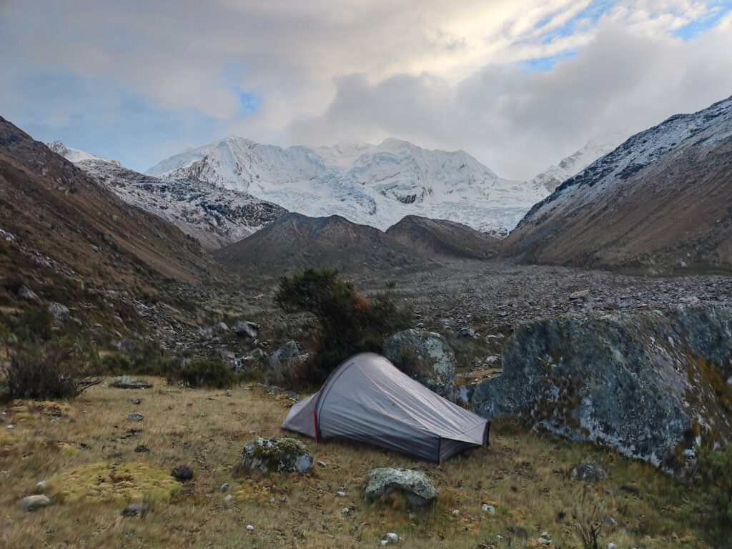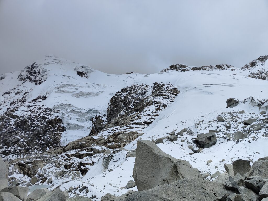 Réveil à 5h, pas de temps à perdre aujourd’hui ! J’aimerais atteindre le col assez tôt, en espérant que le temps soit au rendez-vous, et boucler la fin du trek pour rentrer à Huaraz à une heure décente. La tente est encore trempée, difficile de feindre la surprise…. Dehors le ciel est bien couvert, j’espère que ça va se lever. On distingue à peine les glaciers liés du Tocllaraju et Palcaraju… Heureusement que j’ai pu brièvement en profiter la veille dans l’après-midi.