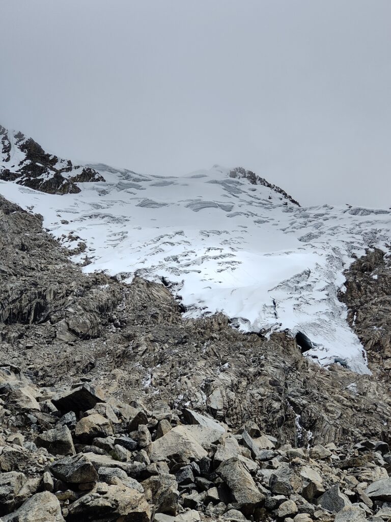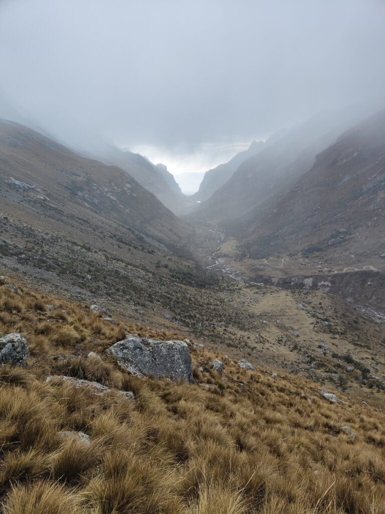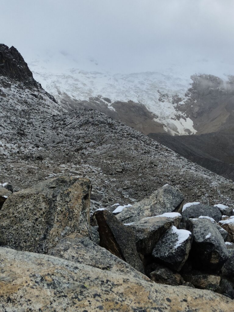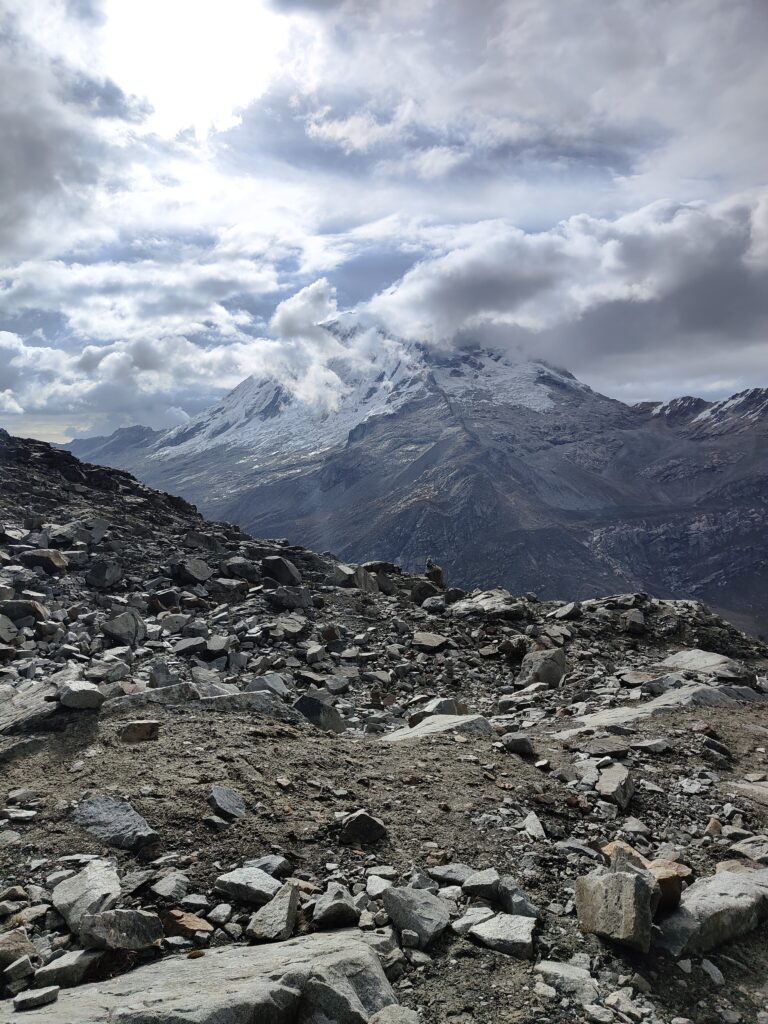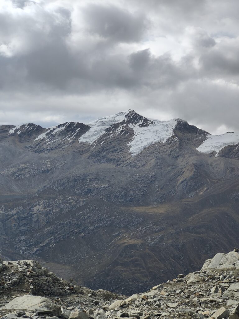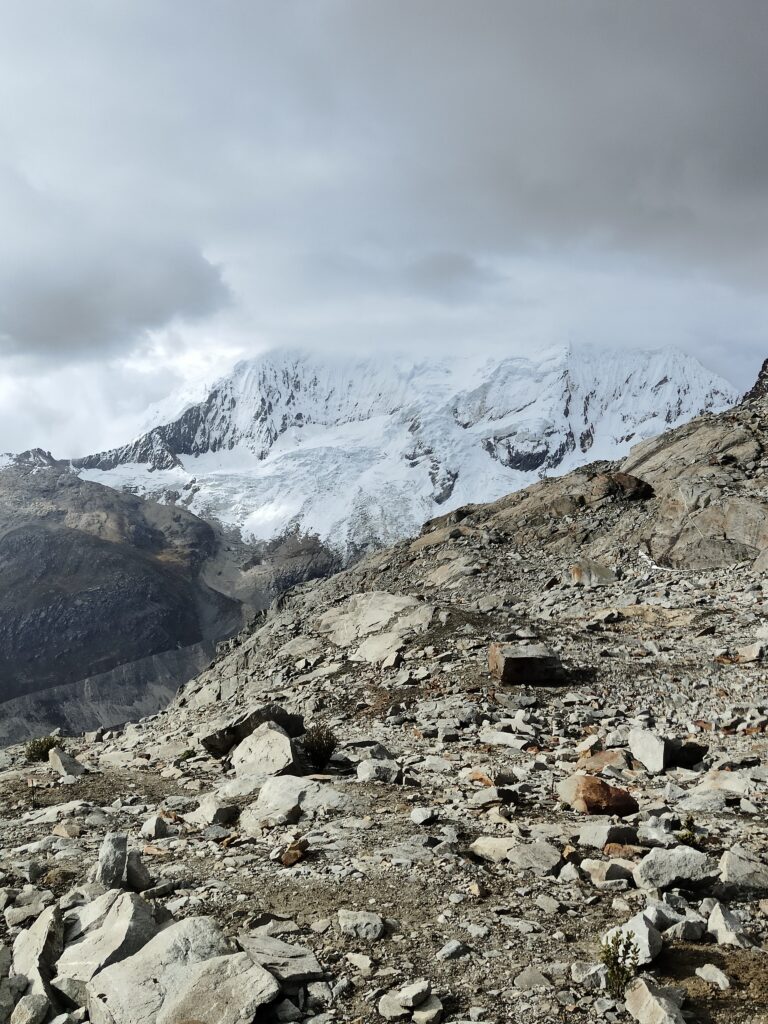 Peu à peu, le trail devient plus clair avec un sillon qui se dessine dans la pente. C’est particulièrement raide et pourtant bien plus roulant que les jours précédents. A mesure que l’on s’élève, le décor devient plus minéral, traversant divers pierriers. Je me retourne pour apprécier quelques sommets qui s’élèvent au dessus de la quebrada. Pour les glaciers, cela semble peine perdue, ils se confondent avec le ciel nuageux. Je doute également pouvoir profiter d’une vue sur les lagunes à leurs pieds, cachées par les divers éléments rocheux. Pour en profiter, je pense qu’il est nécessaire de prendre le trail au Tocllaraju depuis le refuge (indiqué et visible) et de monter 200-300m en altitude, avant d’atteindre le glacier. Ça me semble être le meilleur angle de vue, qui permet également d’avoir le glacier du Palcaraju en arrière-plan. Les images satellite m’avaient laissé espérer un magnifique complexe de lagunes mais je n’en verrai finalement pas les couleurs.
