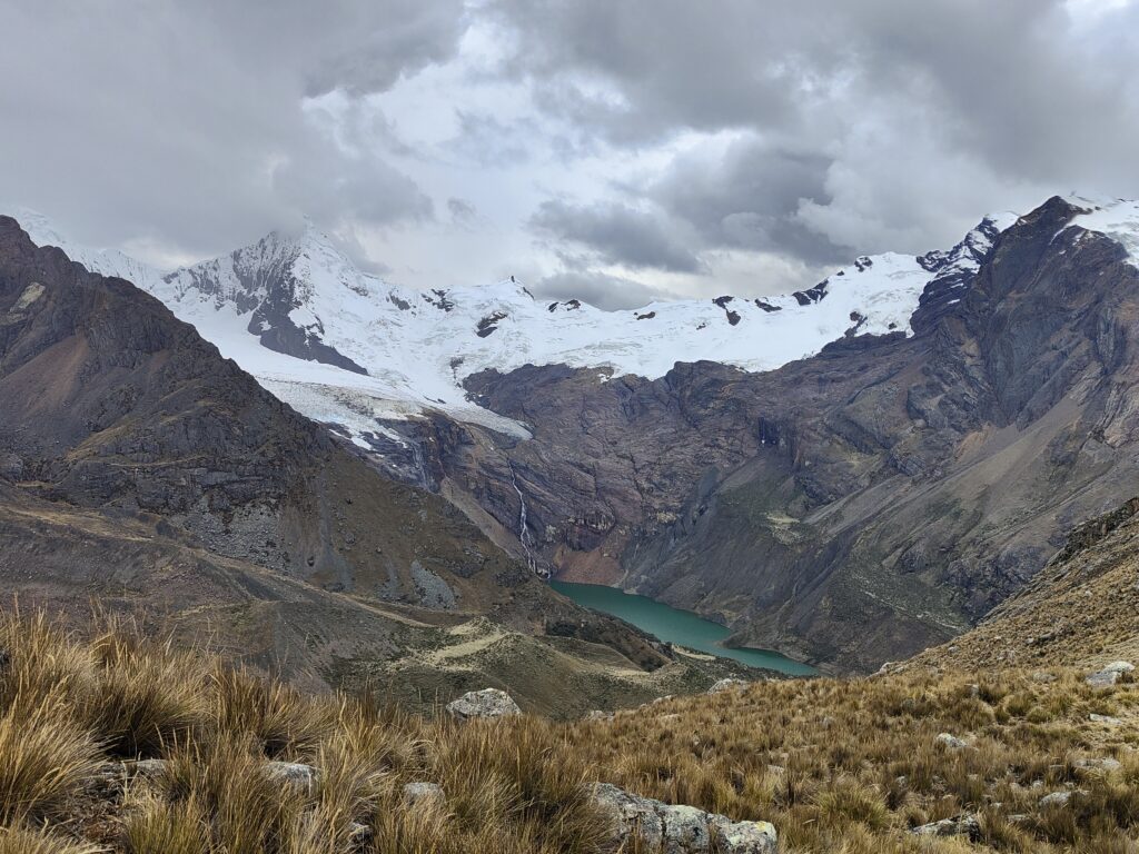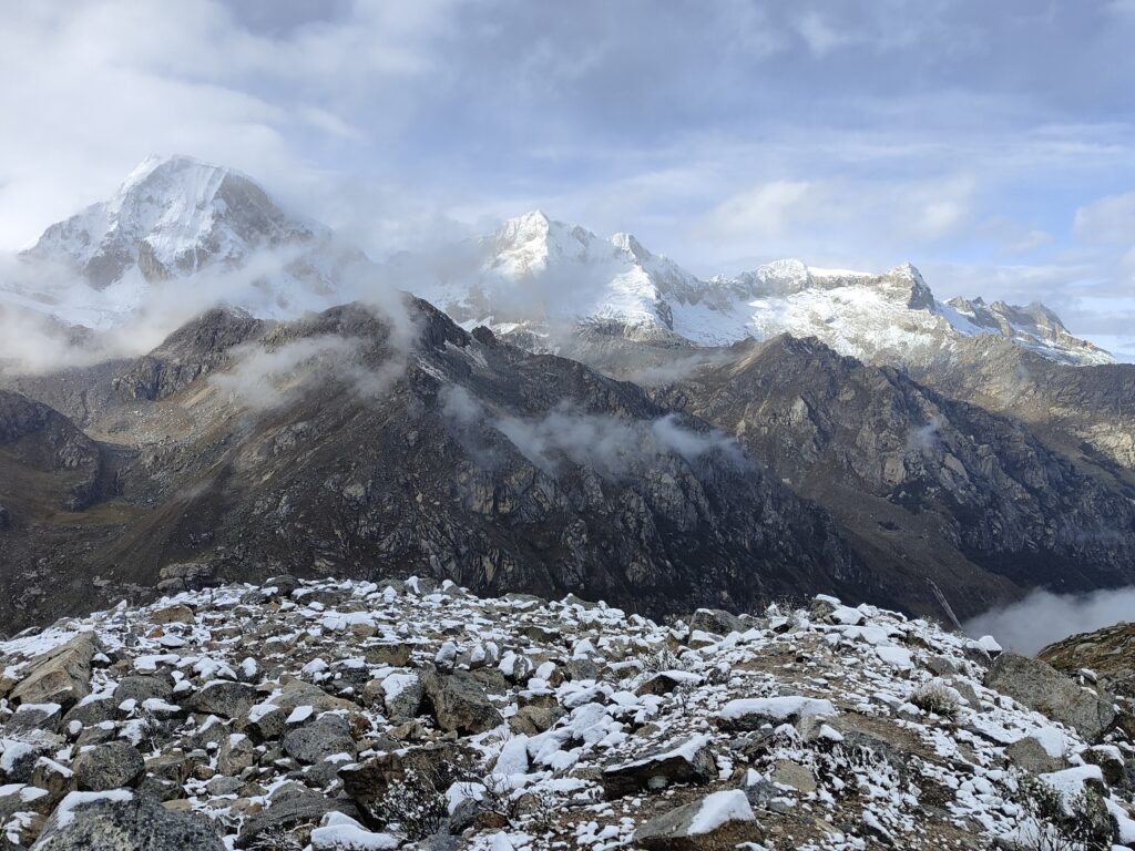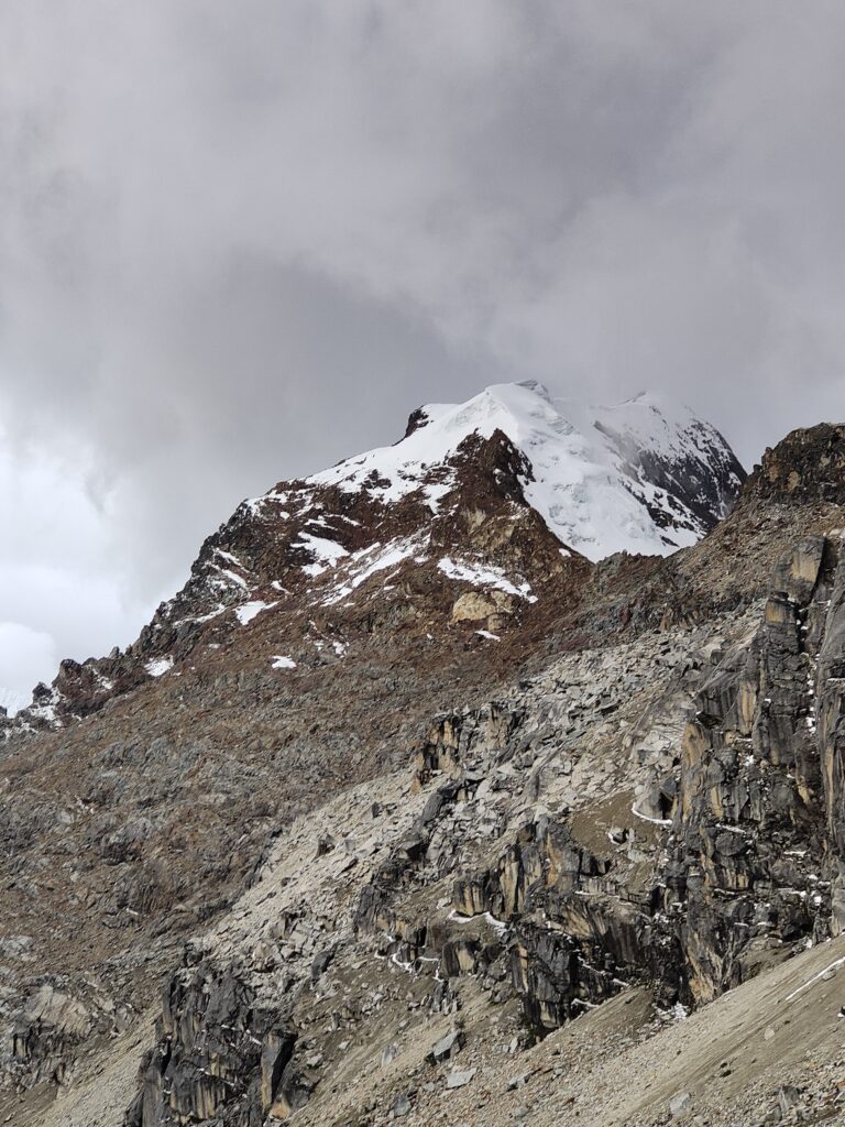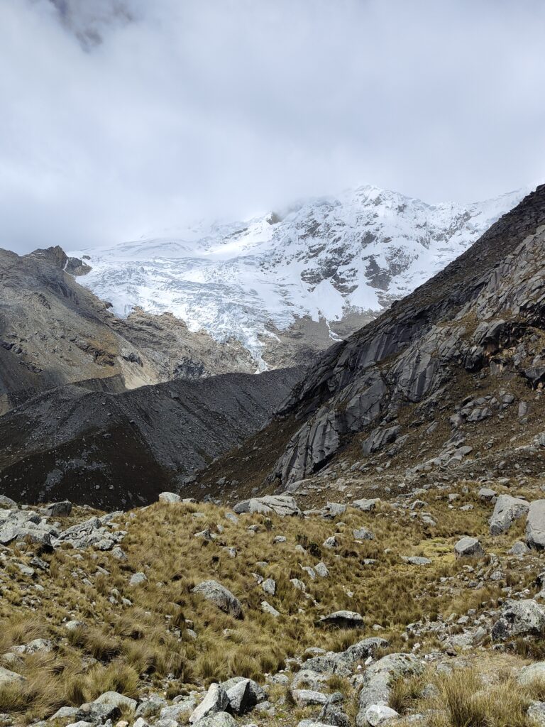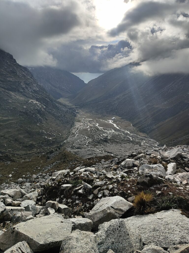 Peu à peu, le trail devient plus clair avec un sillon qui se dessine dans la pente. C’est particulièrement raide et pourtant bien plus roulant que les jours précédents. A mesure que l’on s’élève, le décor devient plus minéral, traversant divers pierriers. Je me retourne pour apprécier quelques sommets qui s’élèvent au dessus de la quebrada. Pour les glaciers, cela semble peine perdue, ils se confondent avec le ciel nuageux. Je doute également pouvoir profiter d’une vue sur les lagunes à leurs pieds, cachées par les divers éléments rocheux. Pour en profiter, je pense qu’il est nécessaire de prendre le trail au Tocllaraju depuis le refuge (indiqué et visible) et de monter 200-300m en altitude, avant d’atteindre le glacier. Ça me semble être le meilleur angle de vue, qui permet également d’avoir le glacier du Palcaraju en arrière-plan. Les images satellite m’avaient laissé espérer un magnifique complexe de lagunes mais je n’en verrai finalement pas les couleurs.