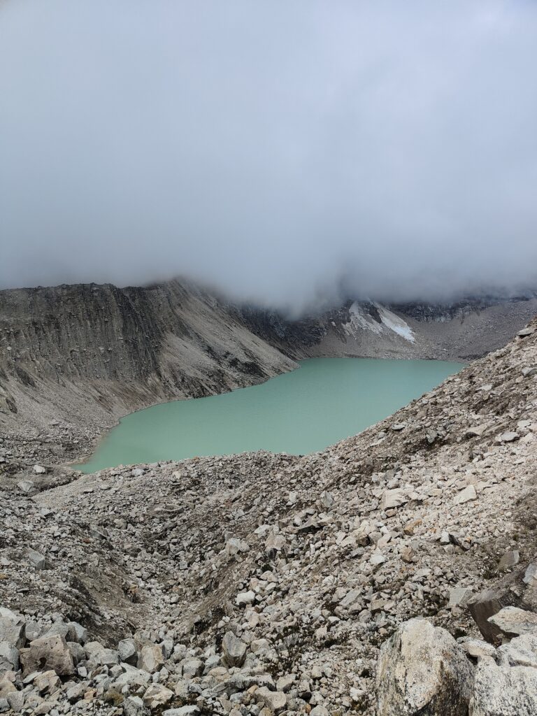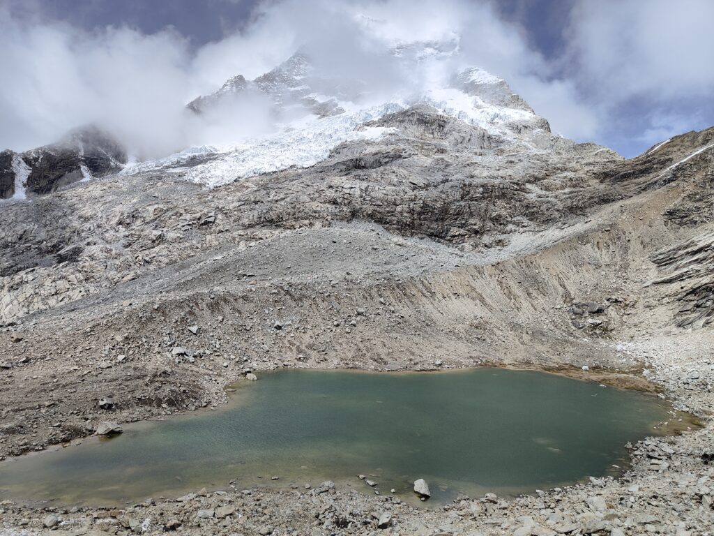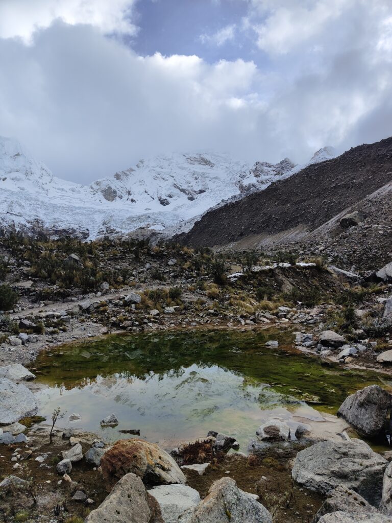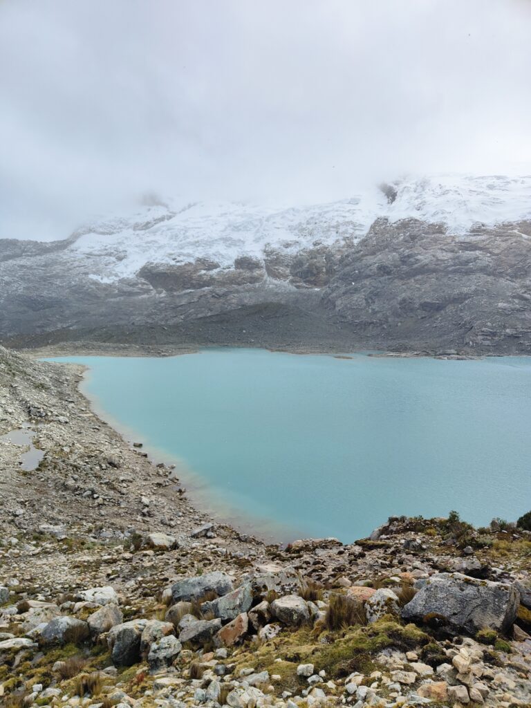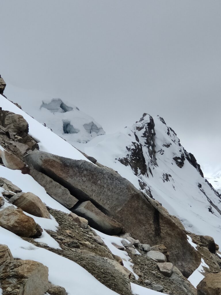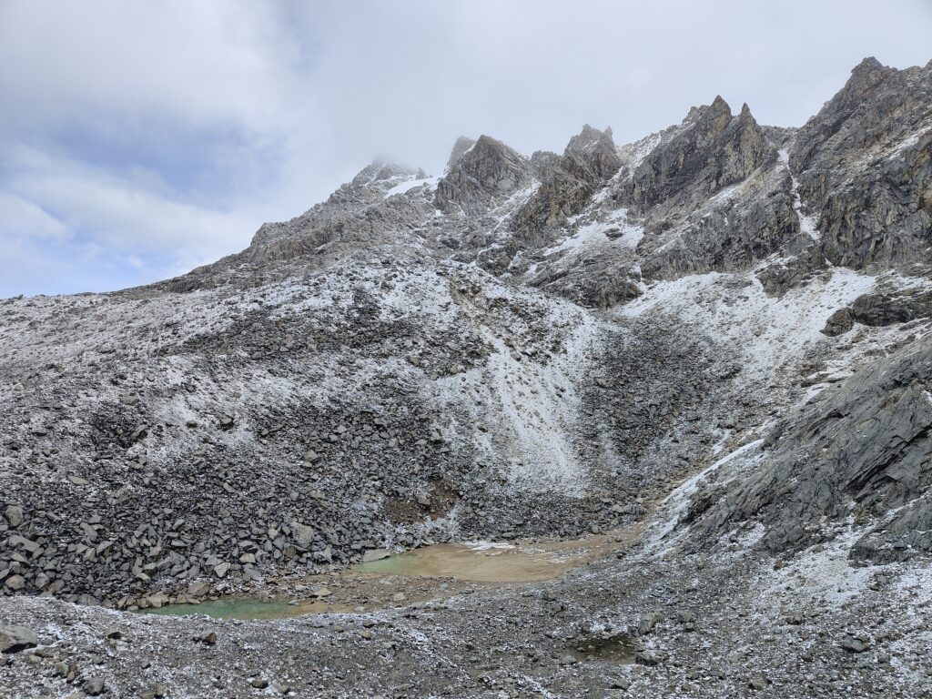 Peu à peu, le trail devient plus clair avec un sillon qui se dessine dans la pente. C’est particulièrement raide et pourtant bien plus roulant que les jours précédents. A mesure que l’on s’élève, le décor devient plus minéral, traversant divers pierriers. Je me retourne pour apprécier quelques sommets qui s’élèvent au dessus de la quebrada. Pour les glaciers, cela semble peine perdue, ils se confondent avec le ciel nuageux. Je doute également pouvoir profiter d’une vue sur les lagunes à leurs pieds, cachées par les divers éléments rocheux. Pour en profiter, je pense qu’il est nécessaire de prendre le trail au Tocllaraju depuis le refuge (indiqué et visible) et de monter 200-300m en altitude, avant d’atteindre le glacier. Ça me semble être le meilleur angle de vue, qui permet également d’avoir le glacier du Palcaraju en arrière-plan. Les images satellite m’avaient laissé espérer un magnifique complexe de lagunes mais je n’en verrai finalement pas les couleurs.