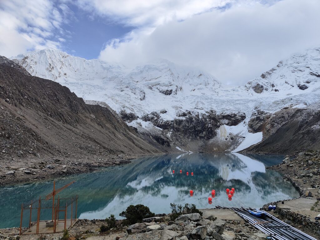 La piste est roulante, je parviens rapidement à la lagune. Au premier abord, un spectacle gâché par d’immenses bouées rouges et des tuyaux au beau milieu du lac. Je suppose que ce sont les gouttières installées il y a une dizaine d’années pour contrôler le niveau du lac et limiter les risques d’inondation. En 1941, après la fracture d’un pan du glacier, des laves torrentielles ont déferlé sur la vallée et Huaraz, tuant plus de 6000 habitants. Ça rappelle tristement la tragédie de Yungay, quelques décennies plus tard. Je crains que cela n’annonce de futures catastrophes dans les années à venir avec le réchauffement climatique.